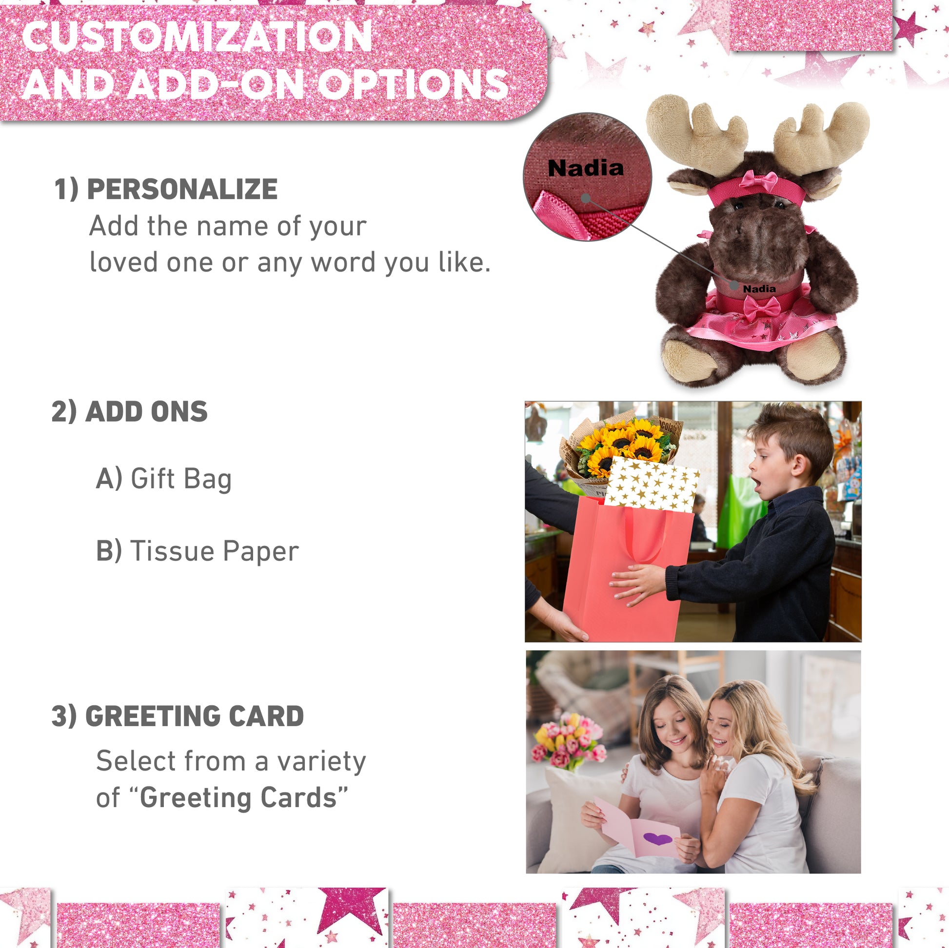Personalization, Customization, and Add-On Options - The sitting moose plush toy comes dressed in a charming pink ballerina outfit, complete with tutu skirt, headband, and shirt. Make it meaningful by personalizing it with the name, which we will imprint directly onto the plush. You can also customize your ballerina moose stuffed animal doll by adding any of our add-ons to create the perfect gift: 1) Gift Bag 2) Tissue Paper 3) Greeting Card.