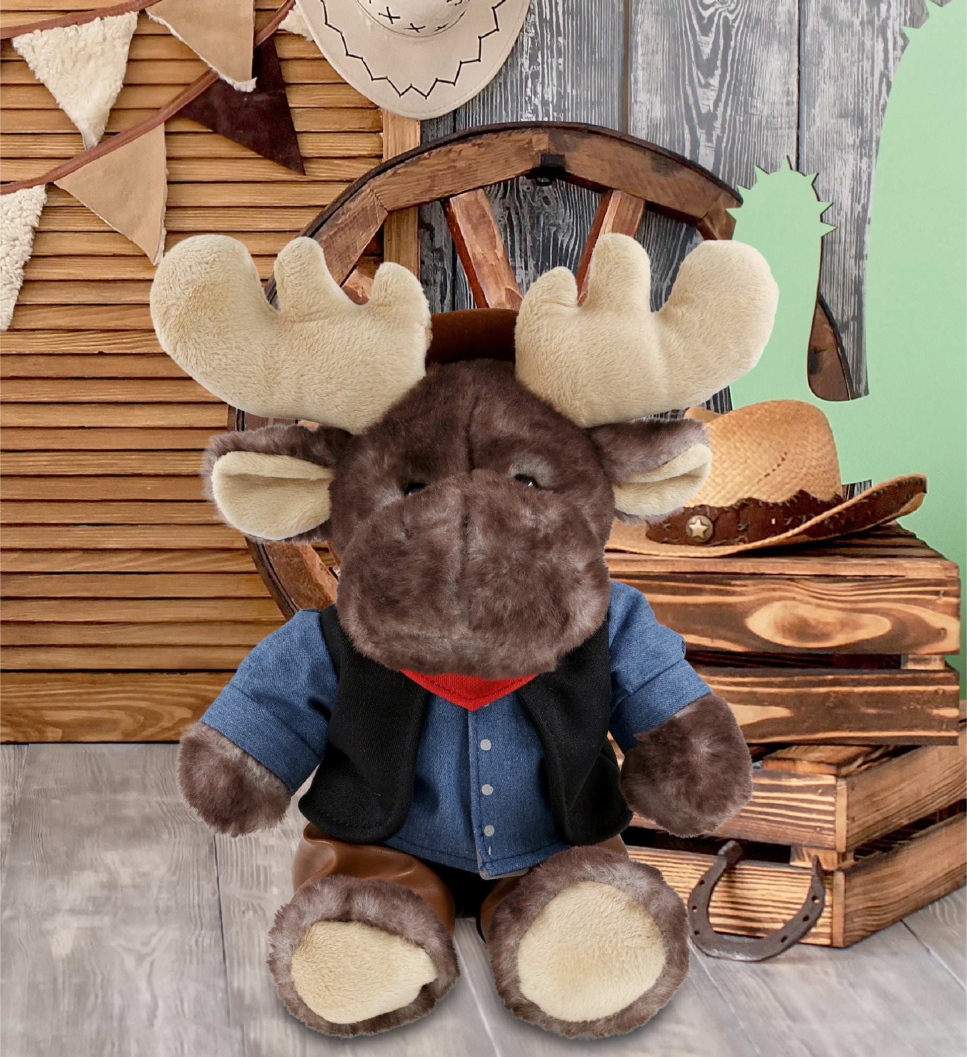 Personalization, Customization and Add-On Options - The moose stuffed animal plush comes dressed in a cowboy outfit, complete with cowboy vest shirt, pants, bandana, and cowboy hat. Make it cool by personalizing it with the name, which we will imprint directly onto the stuffy plush. You can also customize your cowboy plush moose by adding any of our add-ons to create the perfect gift: 1) Gift Bag 2) Tissue Paper 3) Greeting Card.