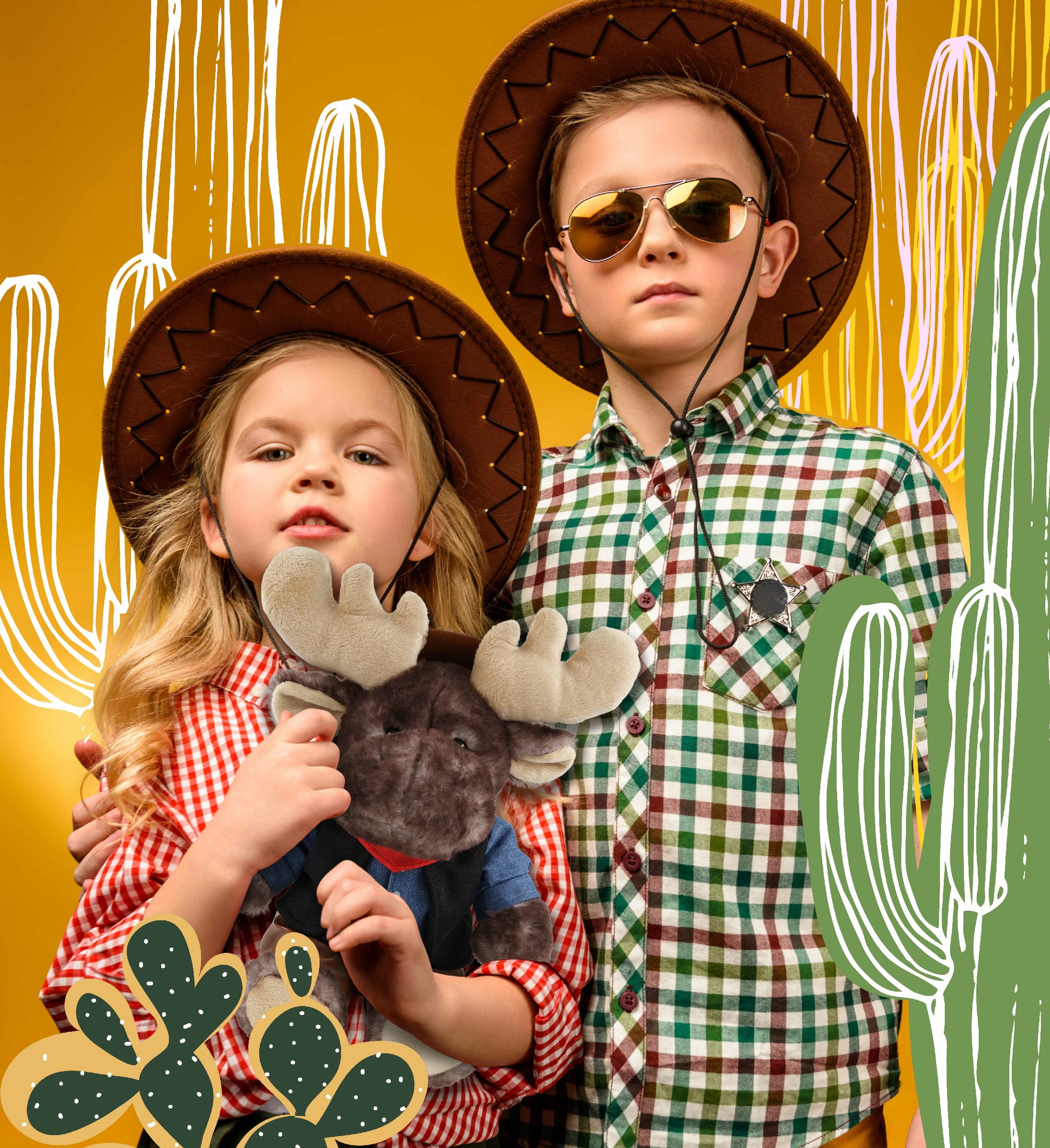 Sitting Moose with Western Outfit Features Realistic Details from its Cowboy Hat to Leather Chaps - From its doll cowboy hat to detailed western outfit, this moose figure rocks a look that’s both fun and stylish. The combo of moose toy and cowboy accessories creates two playful themes, wildlife and the Wild West. The plush moose with cowboy bear outfit makes the perfect addition to your collection of plush toys and cool stuffed animal clothing.