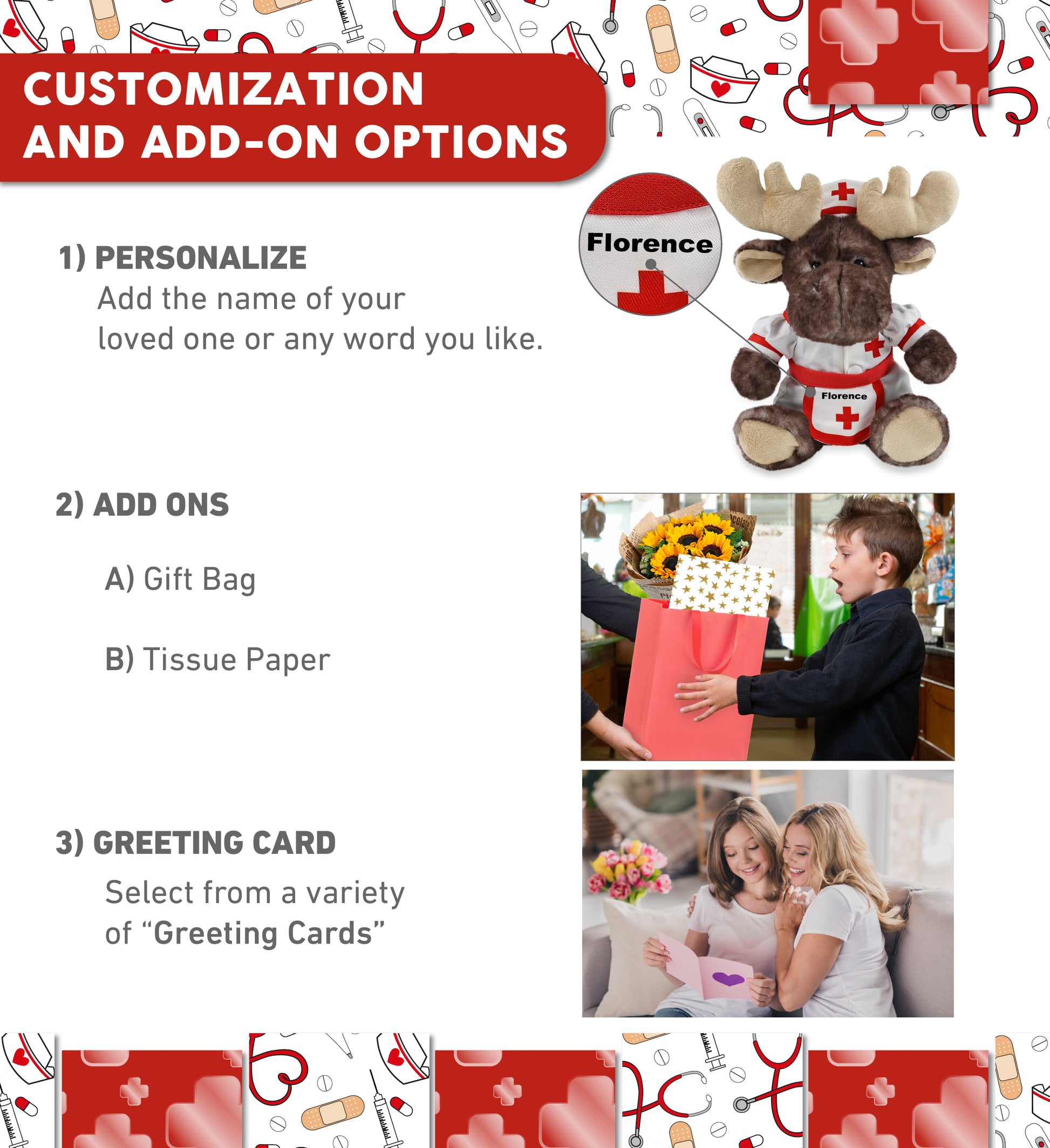Personalization, Customization, and Add-On Options - The stuffed Moose comes dressed in a cute nurse costume, complete with nurse cap, nurse dress and apron. Make your nurse teddy bear stuffed animal plush special by adding a personalized name, which we'll imprint onto the plush. You can also customize your nurse moose plush by adding any of our add-ons to create the perfect gift: 1) Gift Bag 2) Tissue Paper 3) Greeting Card.