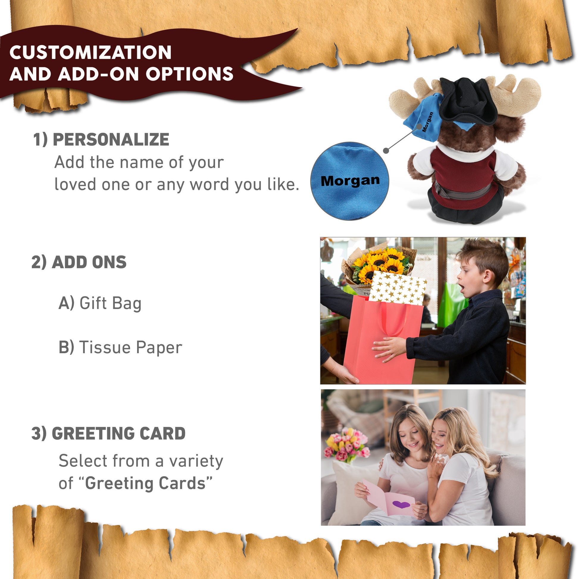 - Personalization, Customization, and Add-On Options - The moose figure stuffed toy comes dressed in full pirate clothes, complete with pirate hat, pirate vest, pirate shirt, pants, belt, and pirate mask. Make your bear doll special by adding a personalized name, which we will imprint onto the plush. You can also customize your stuffed animal by adding any of our add-ons to create the perfect gift: 1) Gift Bag 2) Tissue Paper 3) Greeting Card.