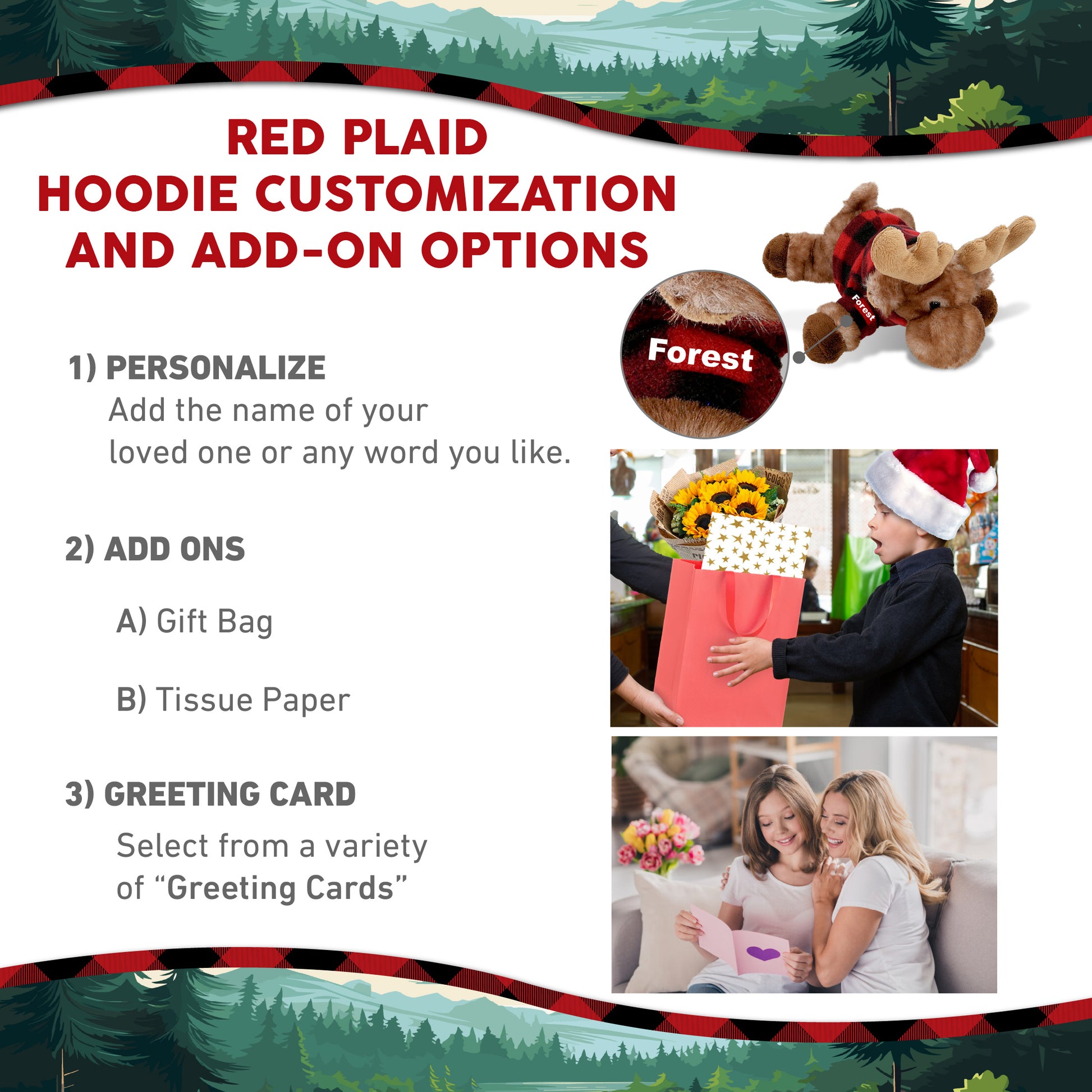 Personalization, Customization, And Add-On Options - The Super Soft Brown Lying Moose Stuffed Animal comes dressed in a cozy teddy bear costume, a red plaid hoodie. Make your moose plush more special and personalize it with the name of your loved one, which we will print onto the plush. You can also customize your plush moose by adding any of our unique add-ons to create the perfect gift: 1) Gift Bag 2) Tissue Paper 3) Greeting Card.