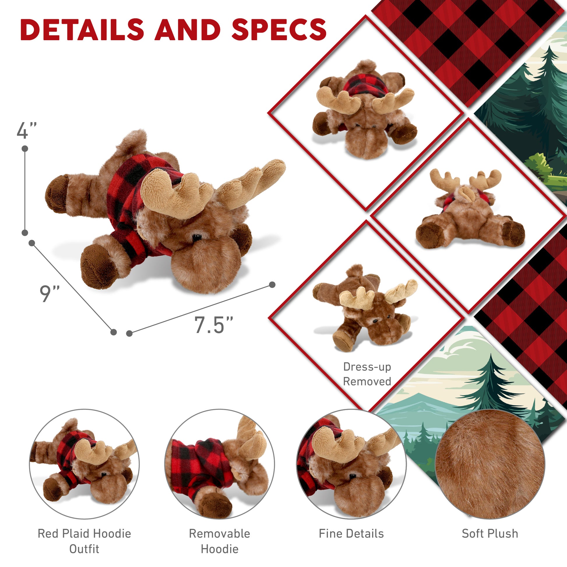 Included with The Purchase of Brown Lying Moose Plush with Red Plaid Hoodie Jacket - Includes 1 Brown Lying Moose with Red Flannel Plaid Shirt. Dressed in flannel hooded jacket, the stuffed moose is all about comfort and style, making it the perfect addition to your Christmas plush animals decor for your Christmas tree, ready to join your holiday photos or family gatherings. The moose with cute red checkered shirt measures 9Lx7.5Wx4H inches.