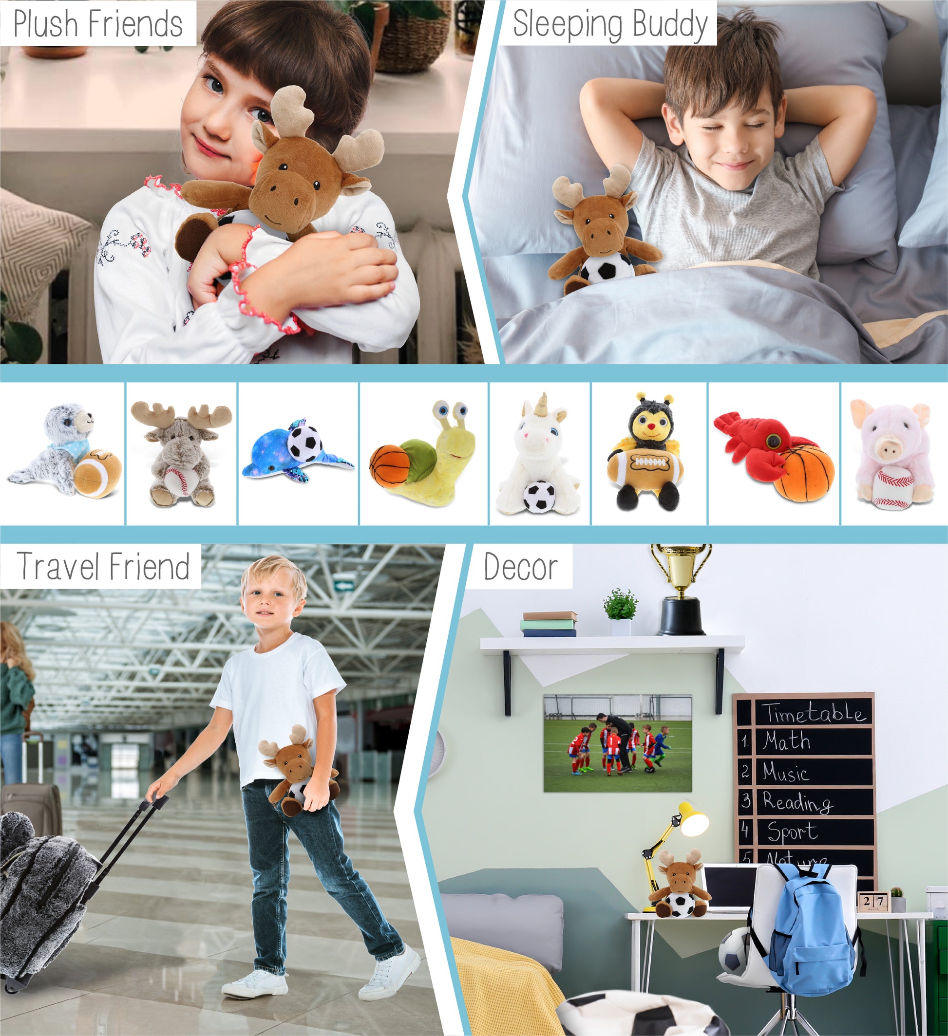 HIGH QUALITY SUPER SOFT PLUSH MOOSE STUFFED ANIMAL - The machine-sewn moose toy plush and soccer ball is made of premium-quality polyester, stuffed with soft fluffy polyester fillings. Made with durable, child-friendly features. Cute and snuggly moose sitting down. Cute soft toys designed to be your little one's best buddies. To maintain fluffy stuffed animals, wash bear plush toys with cold soapy water and allow it to air dry.