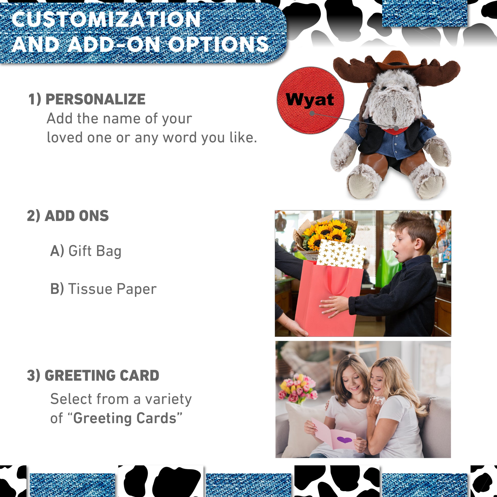 Personalization, Customization and Add-On Options - The moose with clothes stuffed animal plush comes dressed in a cowboy outfit, complete with cowboy vest shirt, pants, bandana, and cowboy hat. Make it cool by personalizing it with the name, which we will imprint directly onto the stuffy plush. You can also customize your cowboy plush moose by adding any of our add-ons to create the perfect gift: 1) Gift Bag 2) Tissue Paper 3) Greeting Card.
