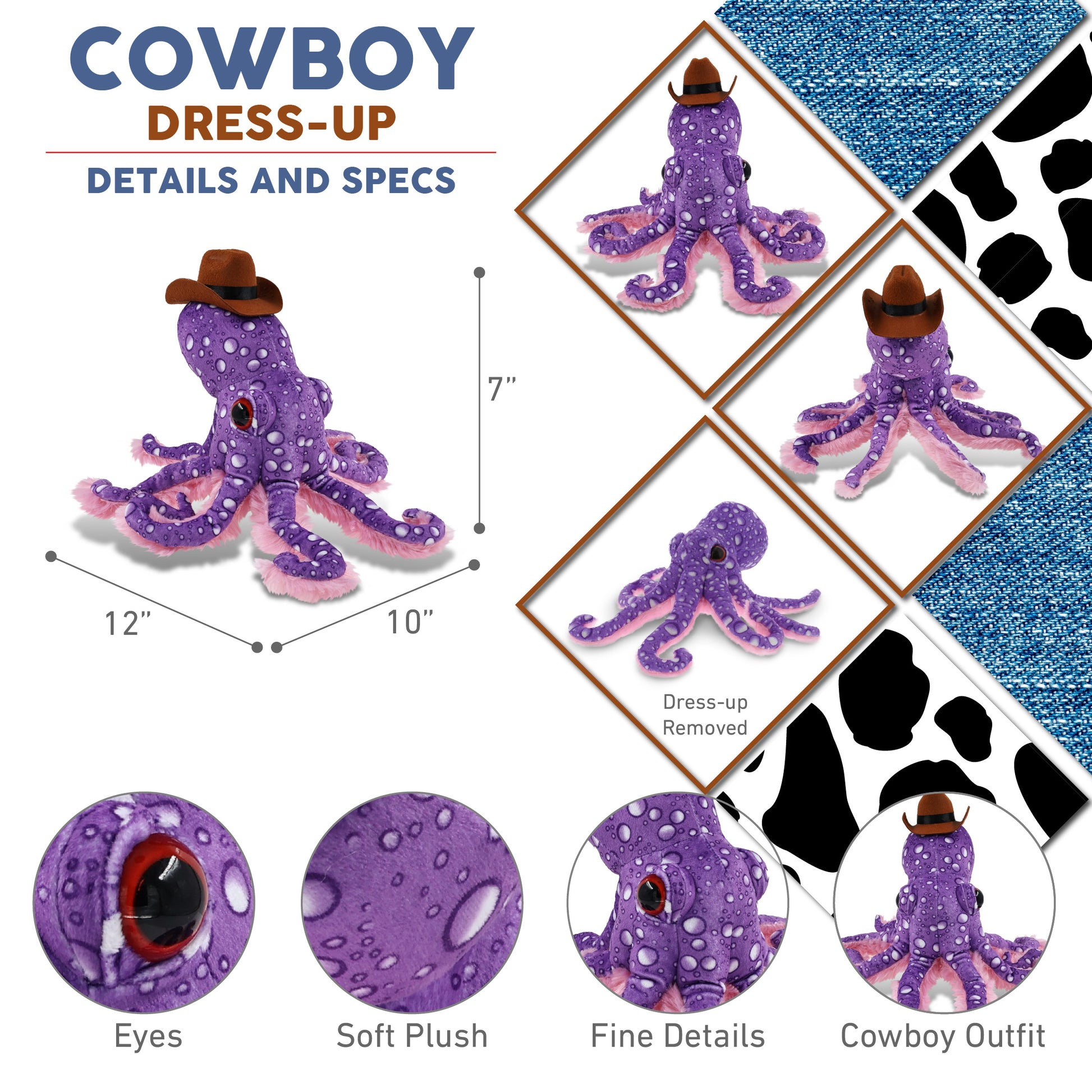 Includes 1 DolliBu Wild Collection Purple Octopus Toy with Cowboy Dress Up Hat - This purple octopus plush arrives with western cowboy plush hat. The cute stuffed toy features a brown cowboy costume hat. Whether you collect adorable stuffed animals or gifts for cowboys with cowboy stuffed animal clothes and accessories, this teddy bear plush toy is the perfect cowboy gift. It measures 12Lx10Wx7H inches and is best for kids ages 3 and up.