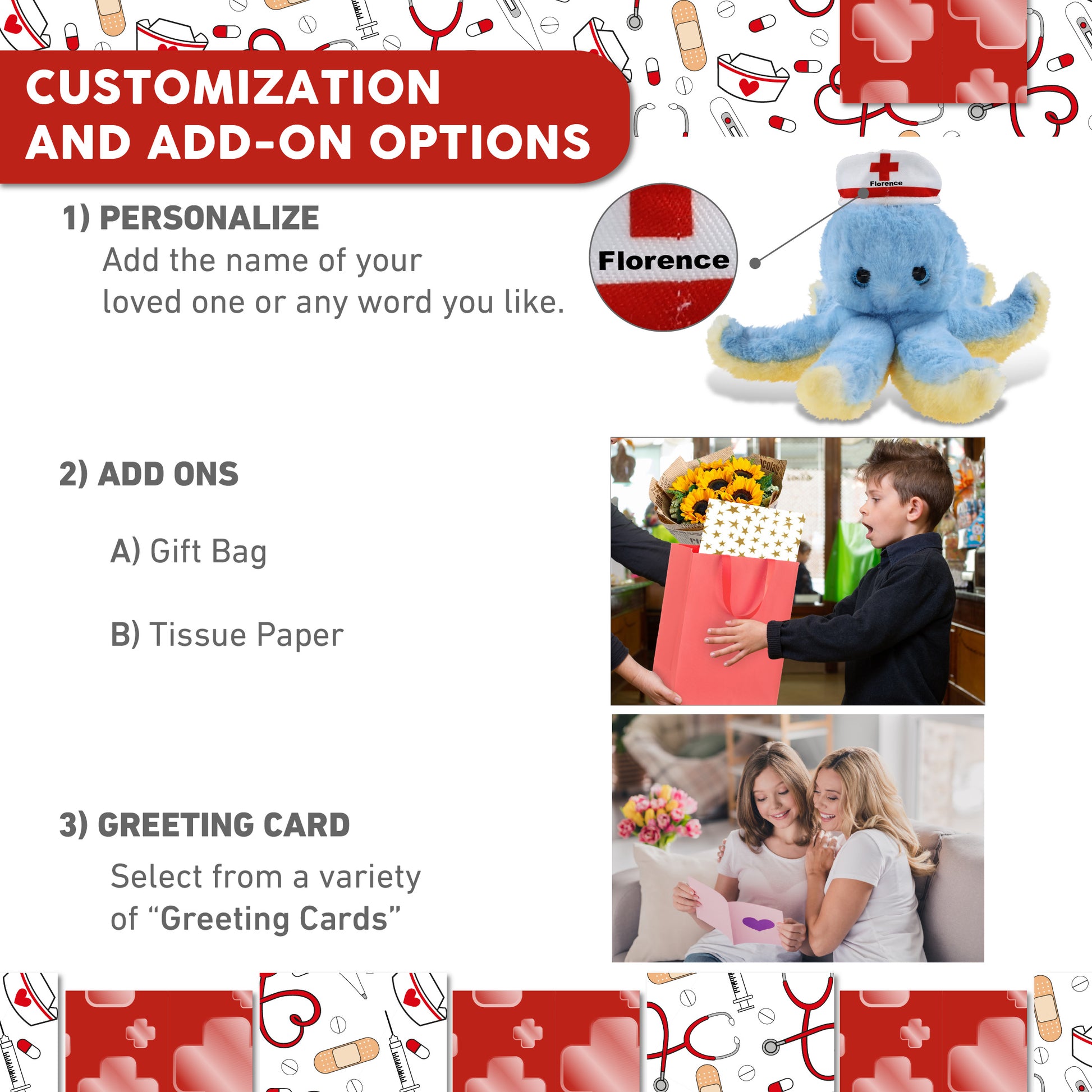 Personalization, Customization, and Add-On Options - The stuffed animal octopus comes dressed in a cute nurse cap. Make your nurse teddy bear stuffed animal plush special by adding a personalized name, which we'll imprint onto the octopus plush. You can also customize your stuffed animal nurse octopus plush by adding any of our add-ons to create the perfect gift: 1) Gift Bag 2) Tissue Paper 3) Greeting Card.