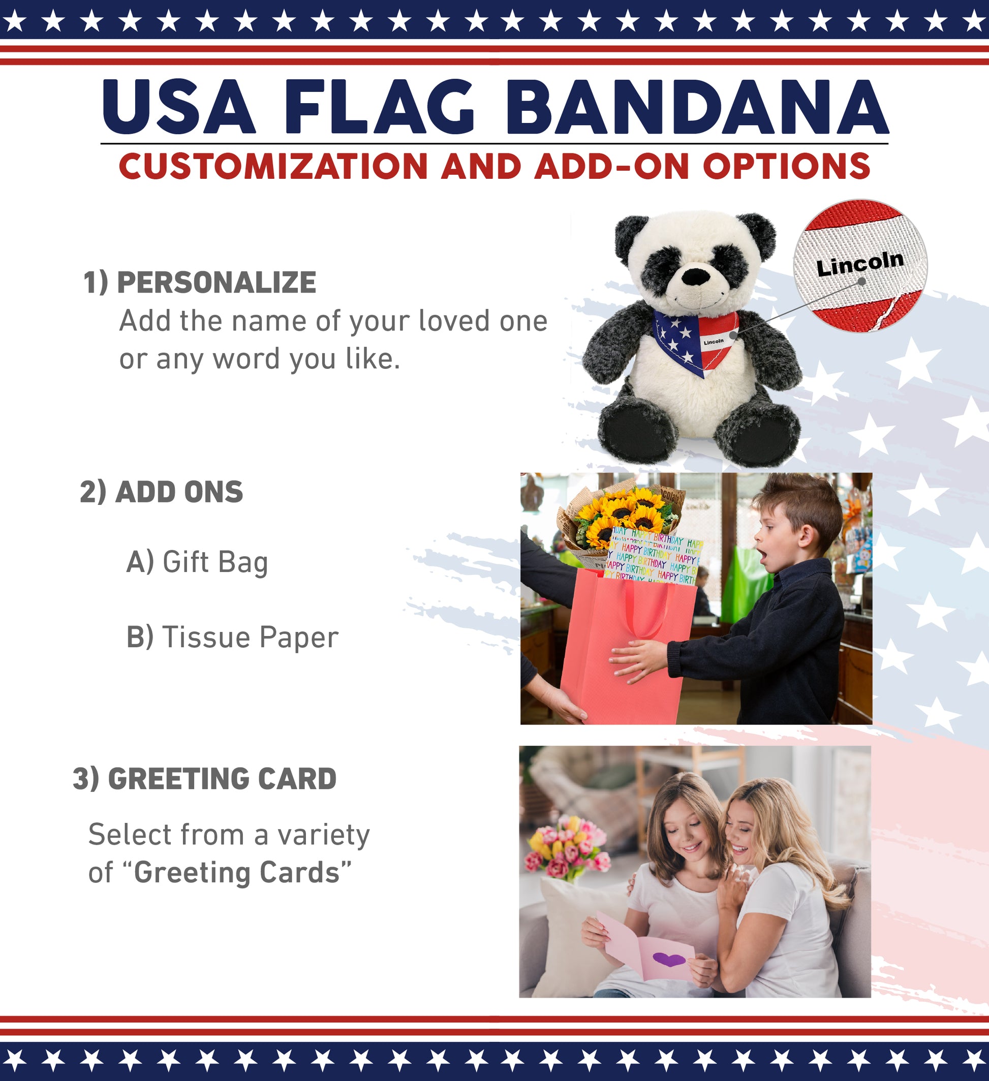 Personalization, Customization, and Add-On Options - The stuffed panda plush toy comes dressed with a removable USA Flag Bandana to give a unique patriotic twist. Make the plush panda toy cool and unique by personalizing it with the name, which we will imprint directly onto the plush. You can also customize your plush panda by adding any of our add-ons to create the perfect gift: 1) Gift Bag 2) Tissue Paper 3) Greeting Card.