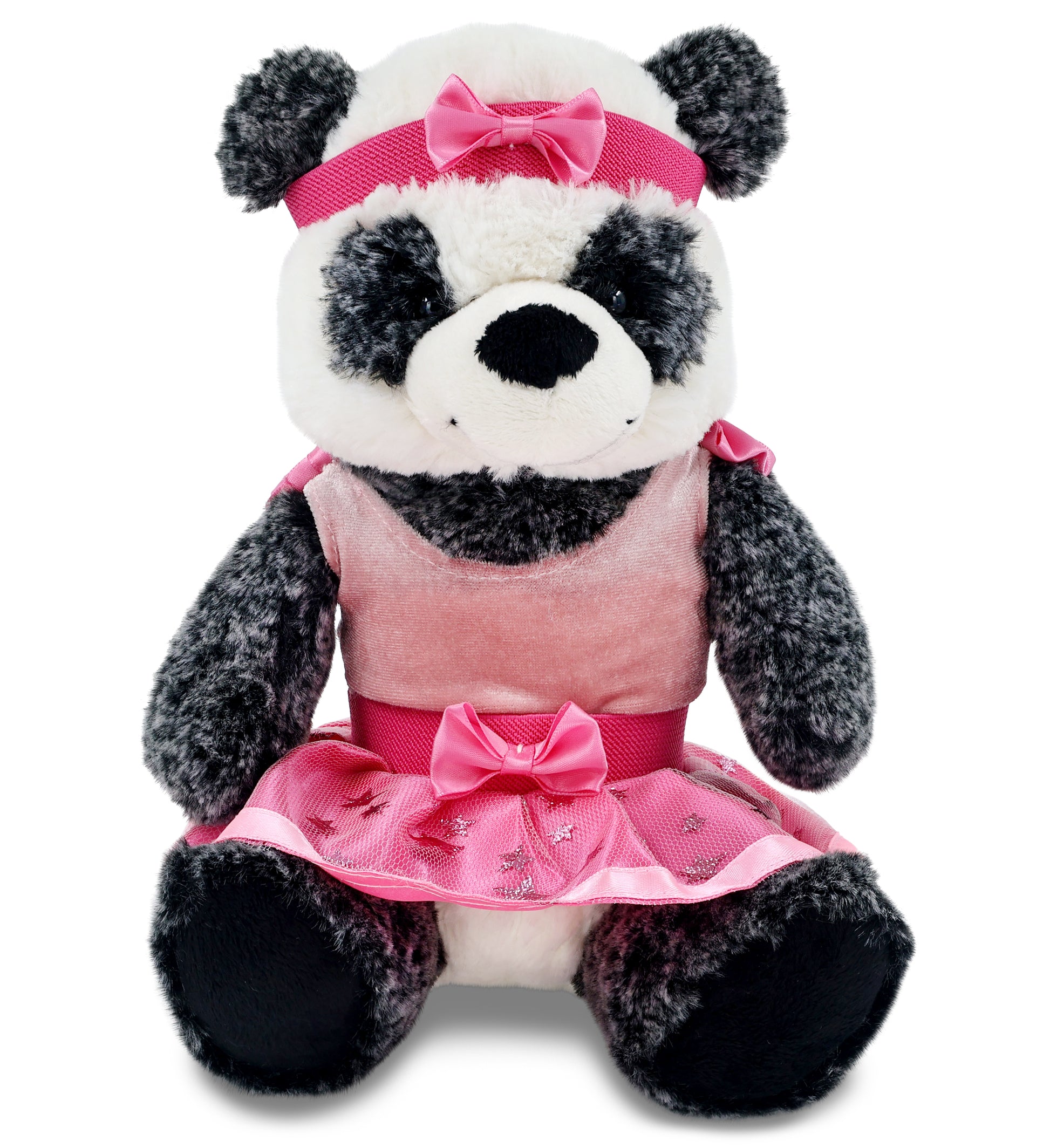 Sitting Panda with Ballet Stuffed Animal Clothes Features a Unique Combination of Wildlife and Ballet - This panda plush ballet doll is wearing pink ballerina plush doll clothes. Perfect gift for ballerinas and dancers. The stuffed teddy bear features a soft plush and a set of ballet plush clothes, with a pink ribbon headband, tutu skirt, and a sleeveless top, making it a soft stuffed animal ballerina panda toy little dancers will enjoy.