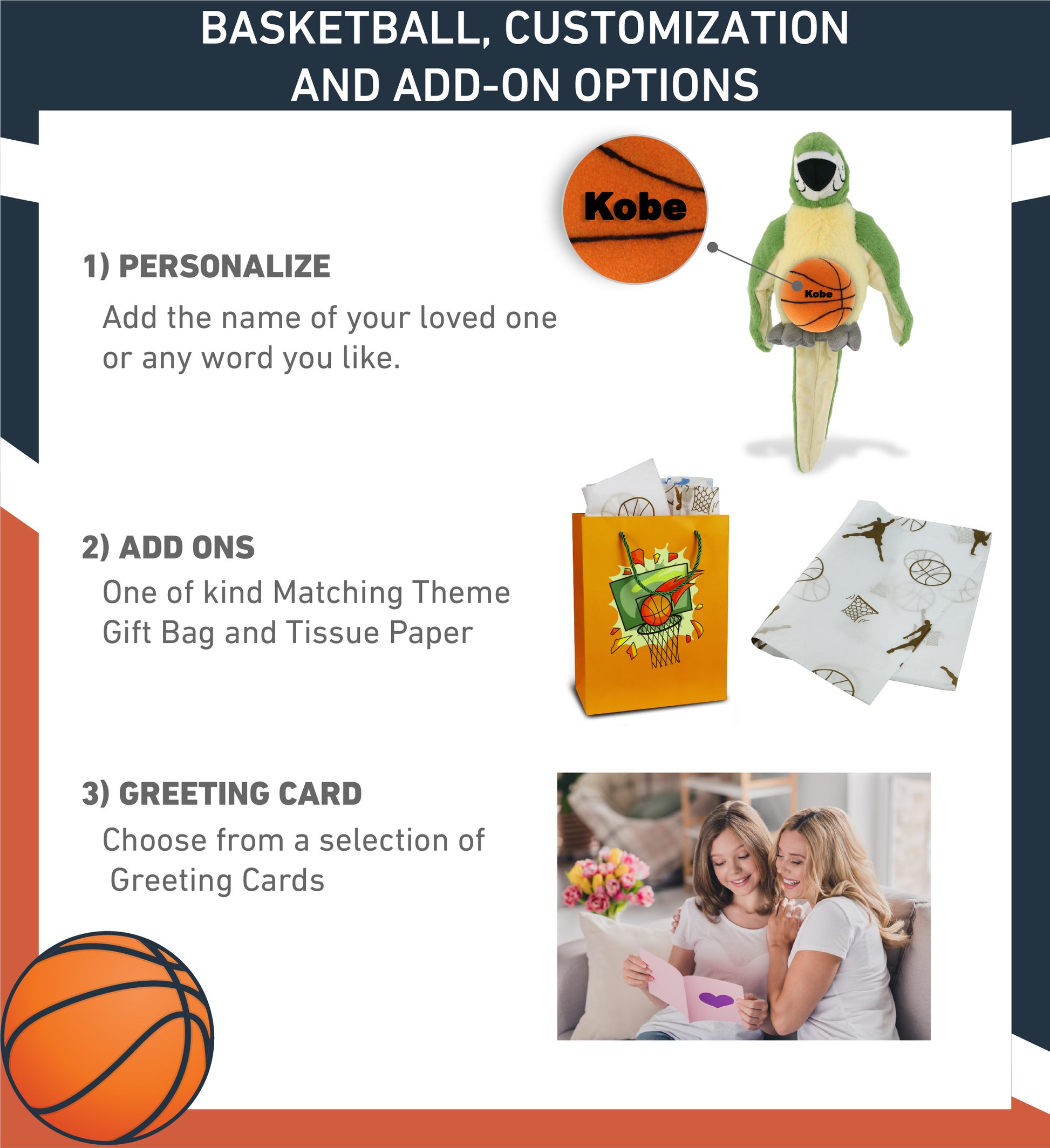 Personalization, Customization, and Add-On Options - The Super Soft Sports Stuffed Animal Green Parrot comes customized with a Basketball Plush. You can personalize your parrot bird plush toy with the name of your loved one, which we will imprint on the item. You also have the option to add some or all of the cool add-ons to make your plush gift extra special: 1) Gift Bag; 2) Tissue Paper; 3) Greeting Card.