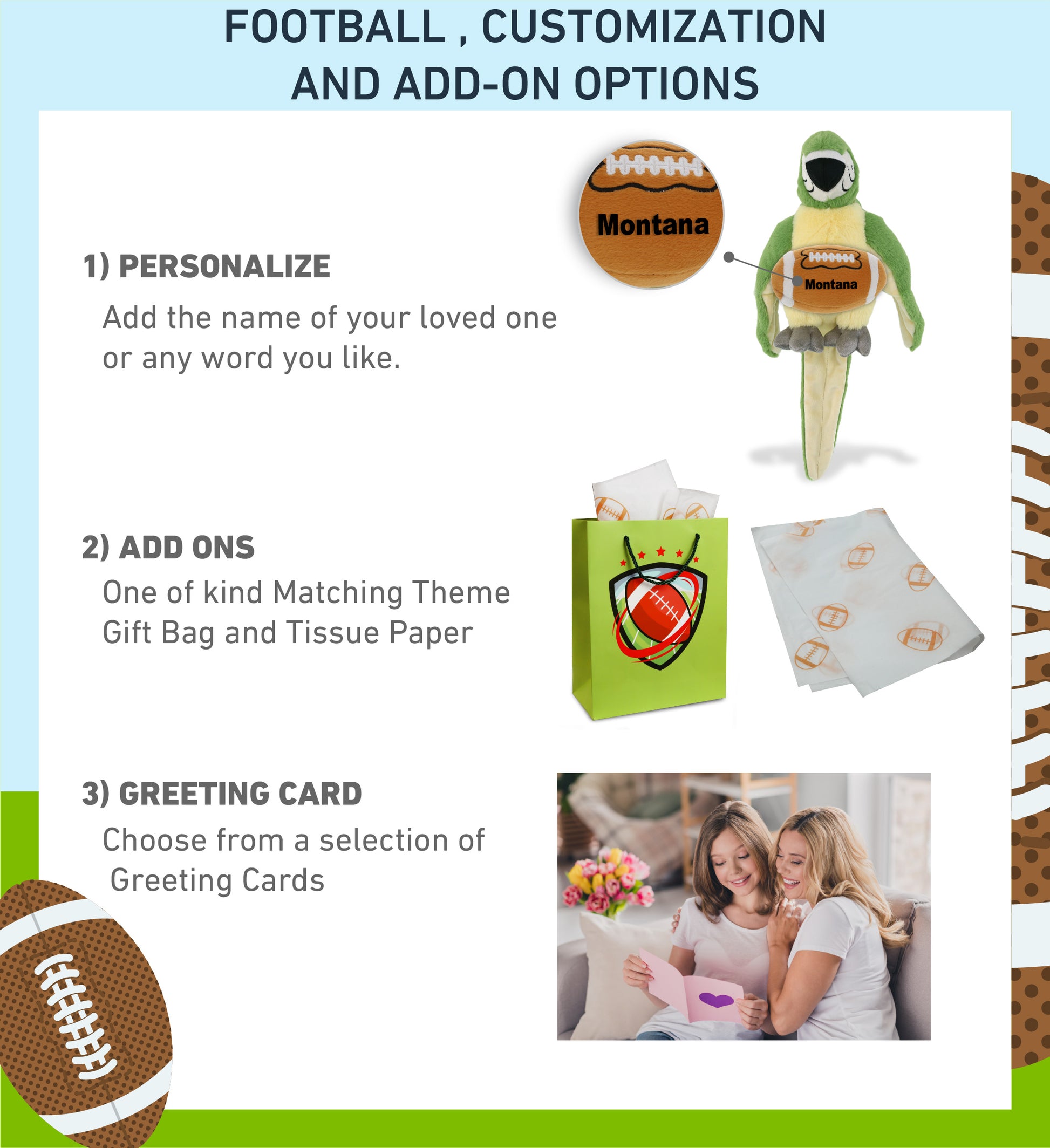 Personalization, Customization, and Add-On Options - This Super Soft Sports Stuffed Animal Green Parrot Plush comes customized with a football plush. You can personalize it with the name of your loved one imprinted on the item. You also have the option to add some or all of the cool add-ons to make your gift extra special: 1) Gift Bag; 2) Tissue Paper; 3) Greeting Card.