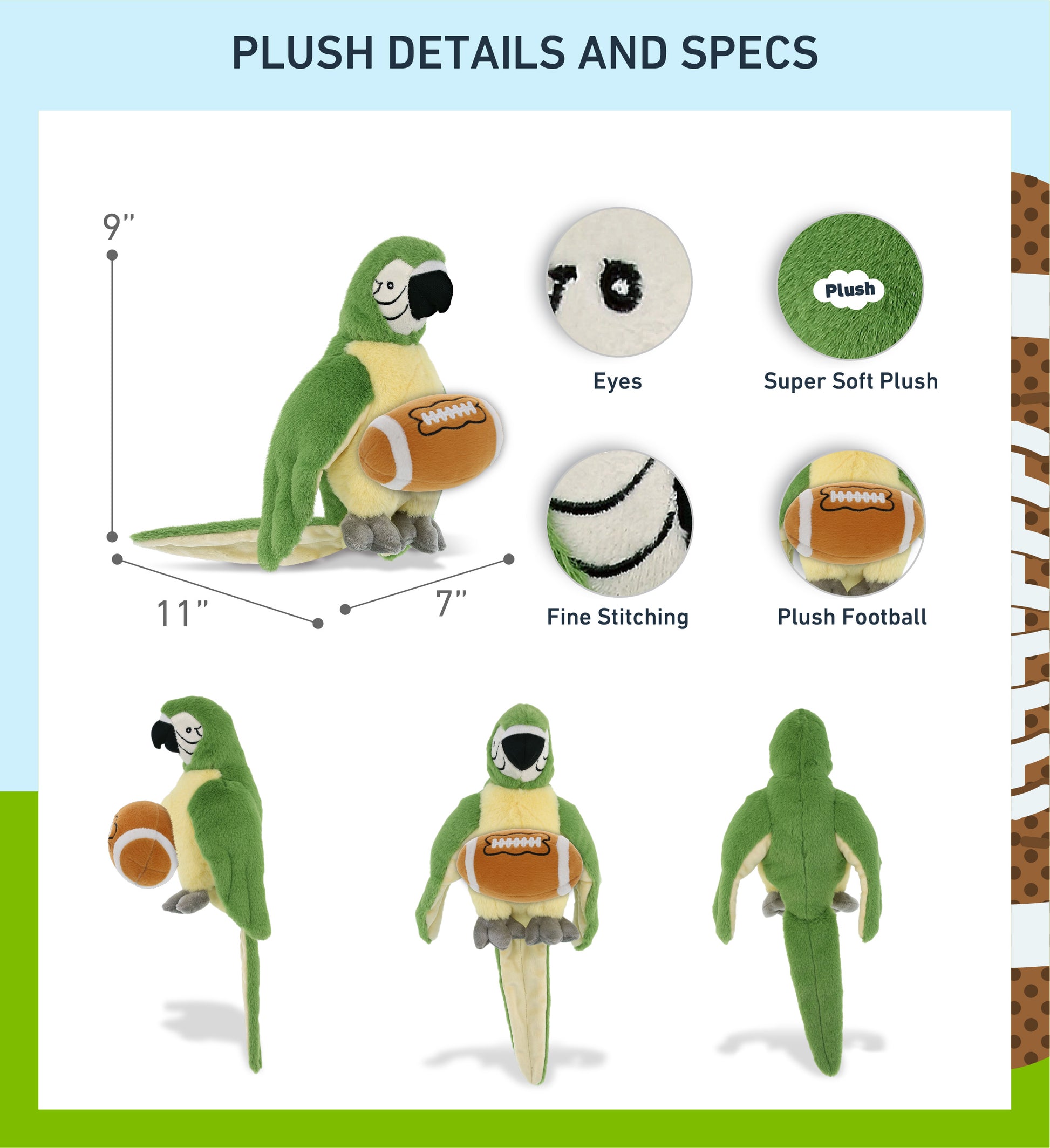 Included with the Purchase of Adorable Cute Parrot Plush - Includes 1 DolliBu Super Soft Green Parrot with a football plush, decorated with realistic features of a cute parrot. The body with a sports gift ball plush makes the plush perfect for cuddles. The parrot plush toy features its iconic beak. The parrot’s eyes make the critter so charming. The cute parrot plush toy buddy measures 11Lx7Wx9H inches.