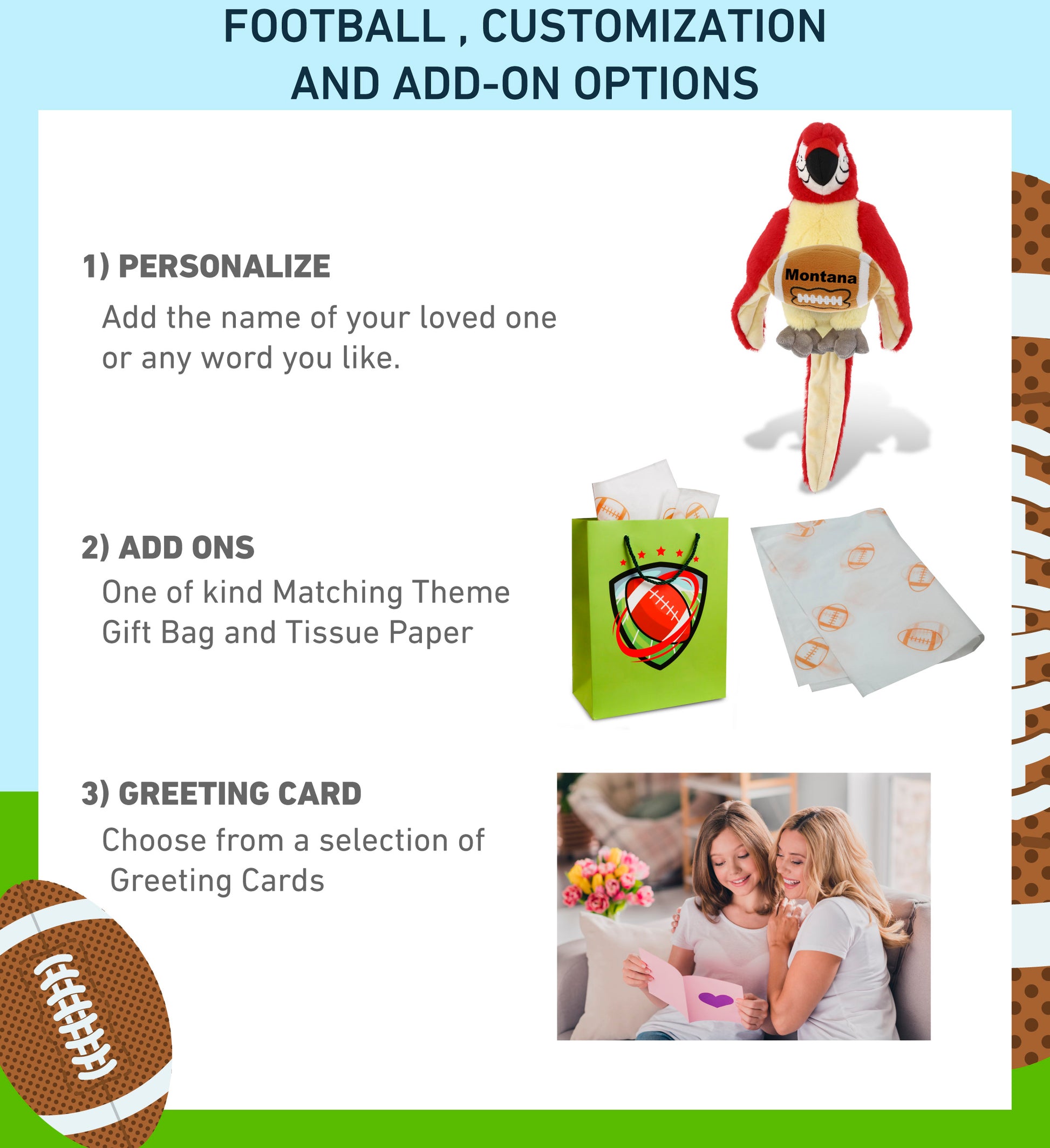 Personalization, Customization, and Add-On Options - This Super Soft Sports Stuffed Animal Red Parrot Plush comes customized with a football plush. You can personalize it with the name of your loved one imprinted on the item. You also have the option to add some or all of the cool add-ons to make your gift extra special: 1) Gift Bag; 2) Tissue Paper; 3) Greeting Card.