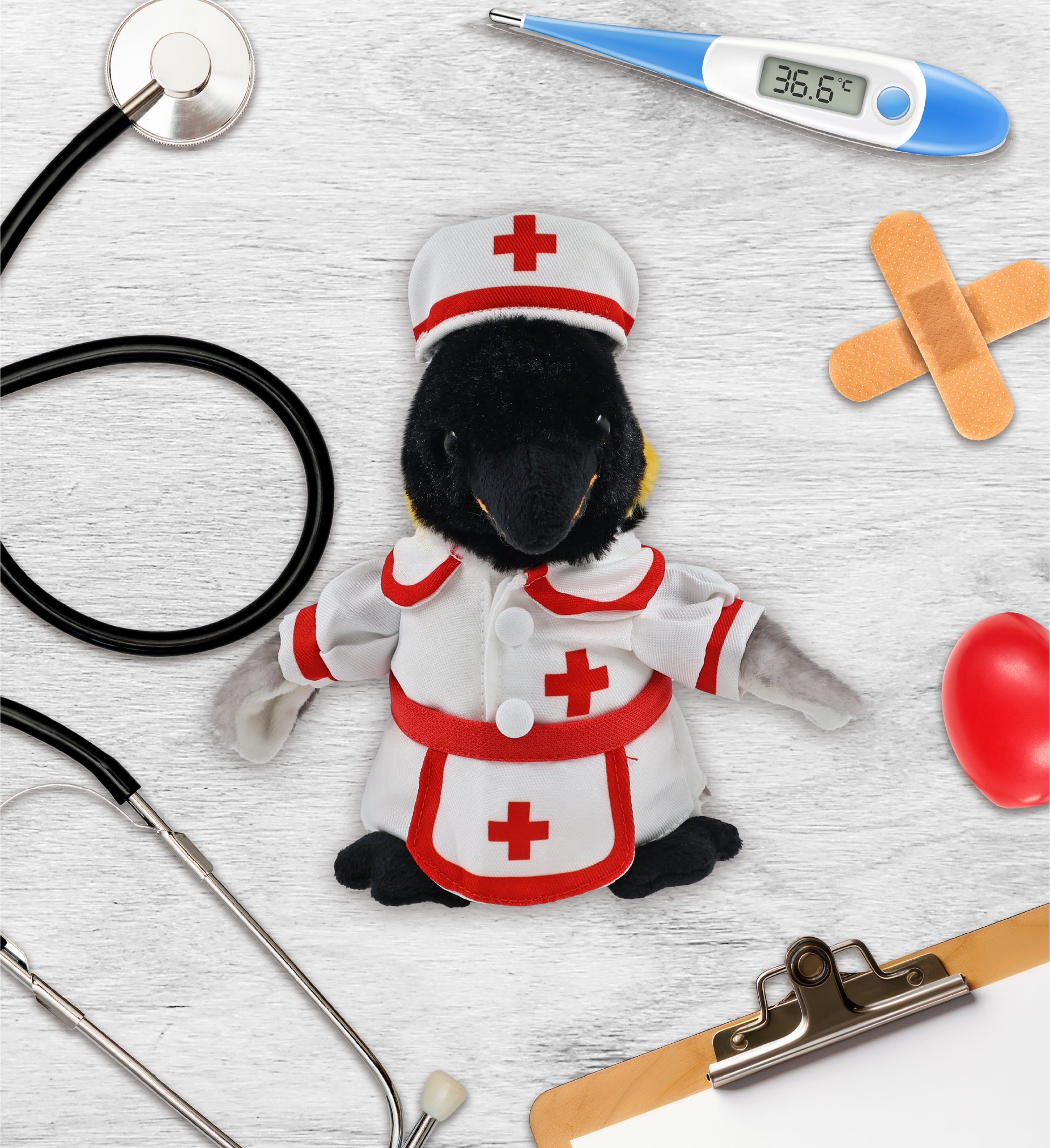 The Penguin with Nurse Stuffed Animal Clothes Features a Classic Nurse Outfit - Designed with red lining and a cross against the white nurse dress and the nurse cap and apron. The penguin stuffed animal plush has soft plush, perfect for everyday snuggles. This stuffed animal with clothes makes the perfect addition to your collection of penguin teddy bear with clothes or giveaway hospital toys to give to sick children.