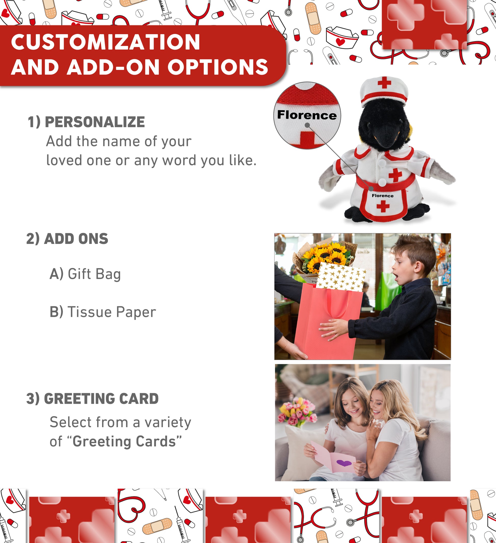 Personalization, Customization, and Add-On Options - The stuffed penguin comes dressed in a cute nurse costume, complete with nurse cap, nurse dress and apron. Make your nurse penguin stuffed animal plush special by adding a personalized name, which we'll imprint onto the plush. You can also customize your nurse penguin plush by adding any of our add-ons to create the perfect gift: 1) Gift Bag 2) Tissue Paper 3) Greeting Card.