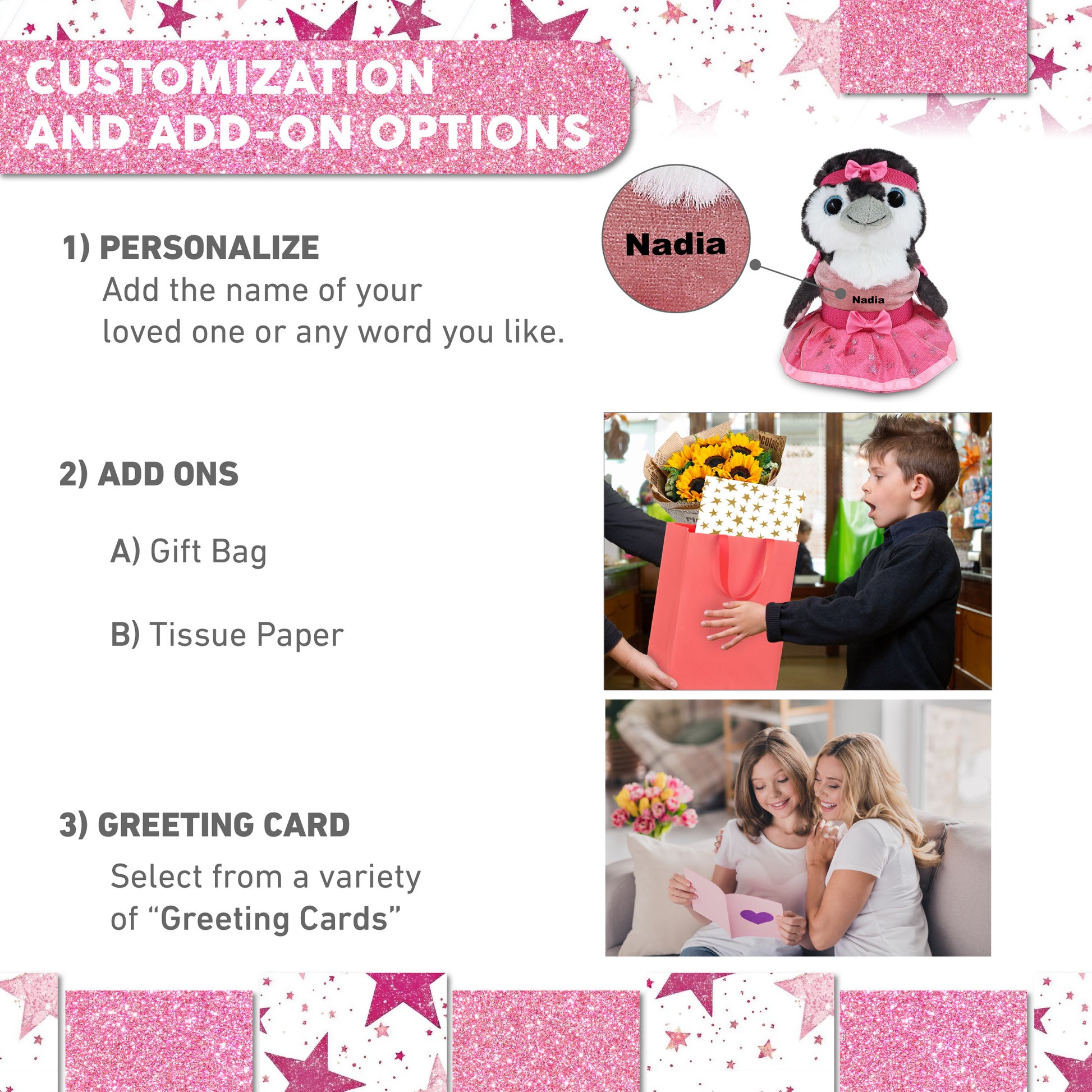 Personalization, Customization, and Add-On Options - The penguin plush toy comes dressed in a charming pink ballerina outfit, complete with tutu skirt, headband, and shirt. Make it meaningful by personalizing it with the name, which we will imprint directly onto the plush. You can also customize your ballerina penguin stuffed animal doll by adding any of our add-ons to create the perfect gift: 1) Gift Bag 2) Tissue Paper 3) Greeting Card.