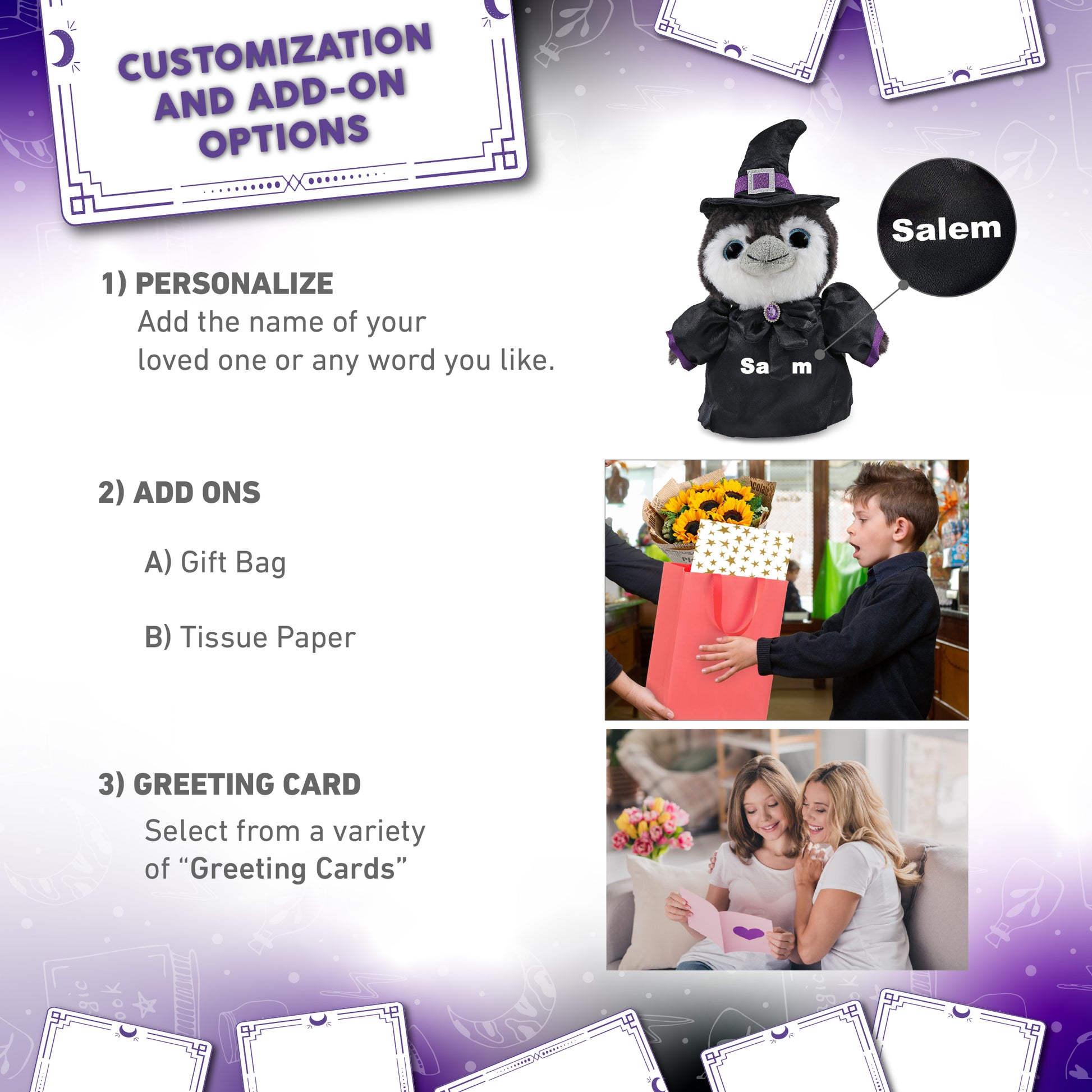 Personalization, Customization, and Add-On Options - The grey penguin Halloween plush toy comes dressed in a witch outfit, complete with black and purple cloak and pointy black witch hat. Make your teddy bear doll special by adding a personalized name, which we will imprint onto the plush. You can also customize your witch penguin stuffed animal by adding any of our add-ons to create the perfect gift: 1) Gift Bag 2) Tissue Paper 3) Greeting Card.
