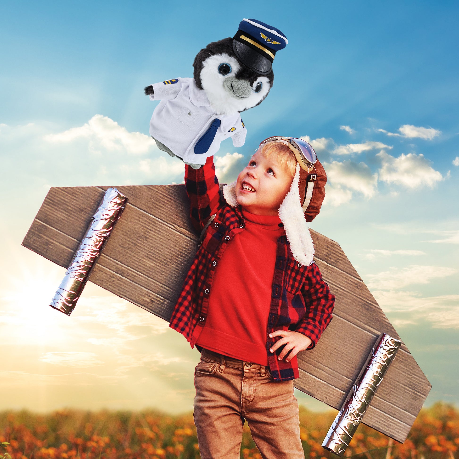 Features a Cute Teddy Bear Plush with Pilot Uniform Costume - This penguin doll features ready-to-fly pilot clothes for teddy bears. The penguin plush features cool details and realistic design, while the pilot career dress up costume features a white button-up aviation uniform shirt with printed pilot wings and sleeve stripes, blue pants with an elastic waistband, a black belt, a matching blue tie, and a classic pilot captain hat.