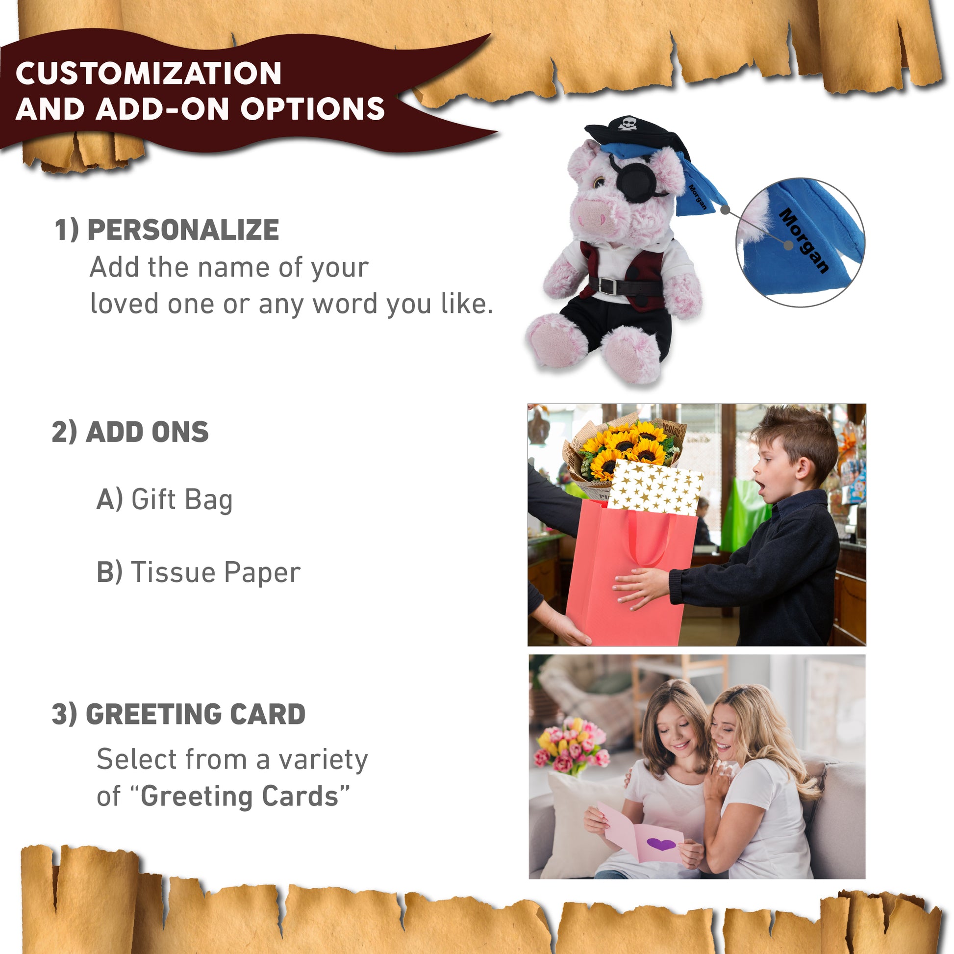 - Personalization, Customization, and Add-On Options - The plush pig figure stuffed toy comes dressed in full pirate clothes, complete with pirate hat, pirate vest, pirate shirt, pants, belt, and pirate mask. Make your bear doll special by adding a personalized name, which we will imprint onto the plush. You can also customize your stuffed animal by adding any of our add-ons to create the perfect gift: 1) Gift Bag 2) Tissue Paper 3) Greeting Card.