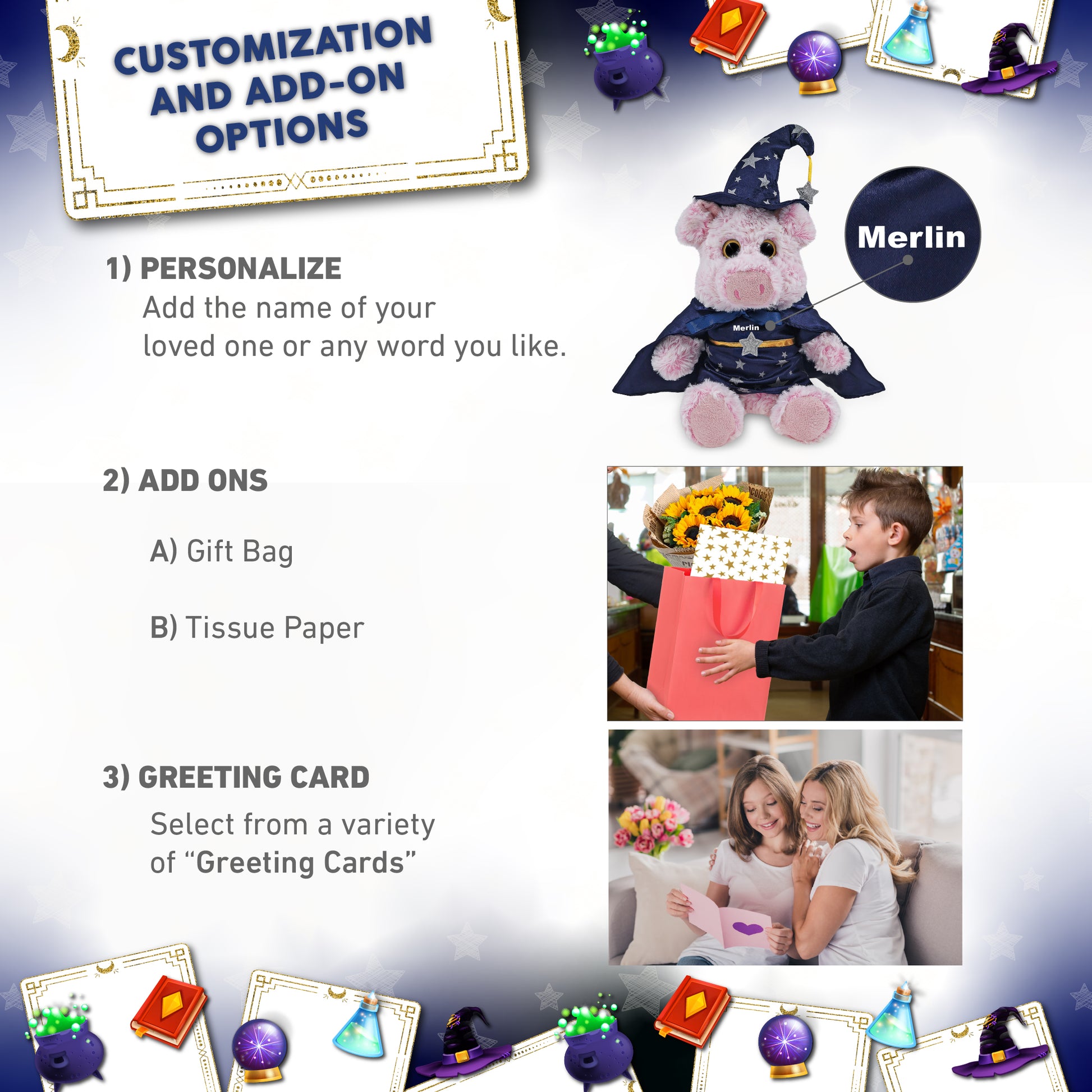 Personalization, Customization, and Add-On Options - The sitting pig stuffed animal comes dressed in a full wizard outfit, with a wizard cloak and hat with star details. Make your wizard stuffed pig special by adding a personalized name, which we will imprint onto the plush. You can customize your plush wizard toy by adding any of our add-ons to create the perfect gift: 1) Gift Bag 2) Tissue Paper 3) Greeting Card.
