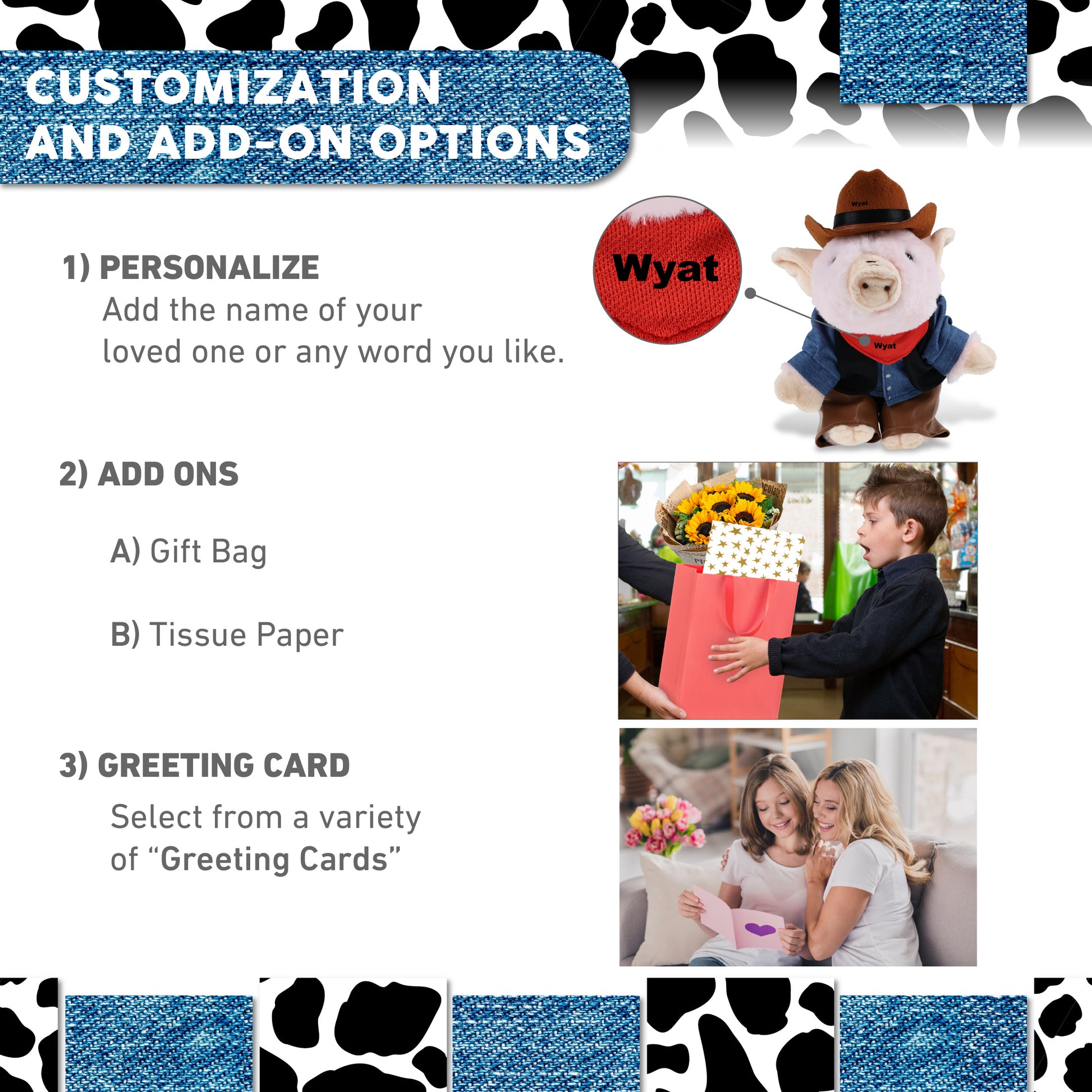 Personalization, Customization and Add-On Options - The piggy stuffed animal plush comes dressed in a cowboy outfit, complete with cowboy vest shirt, pants, bandana, and cowboy hat. Make it cool by personalizing it with the name, which we will imprint directly onto the stuffy plush. You can also customize your cowboy plush piggy by adding any of our add-ons to create the perfect gift: 1) Gift Bag 2) Tissue Paper 3) Greeting Card.