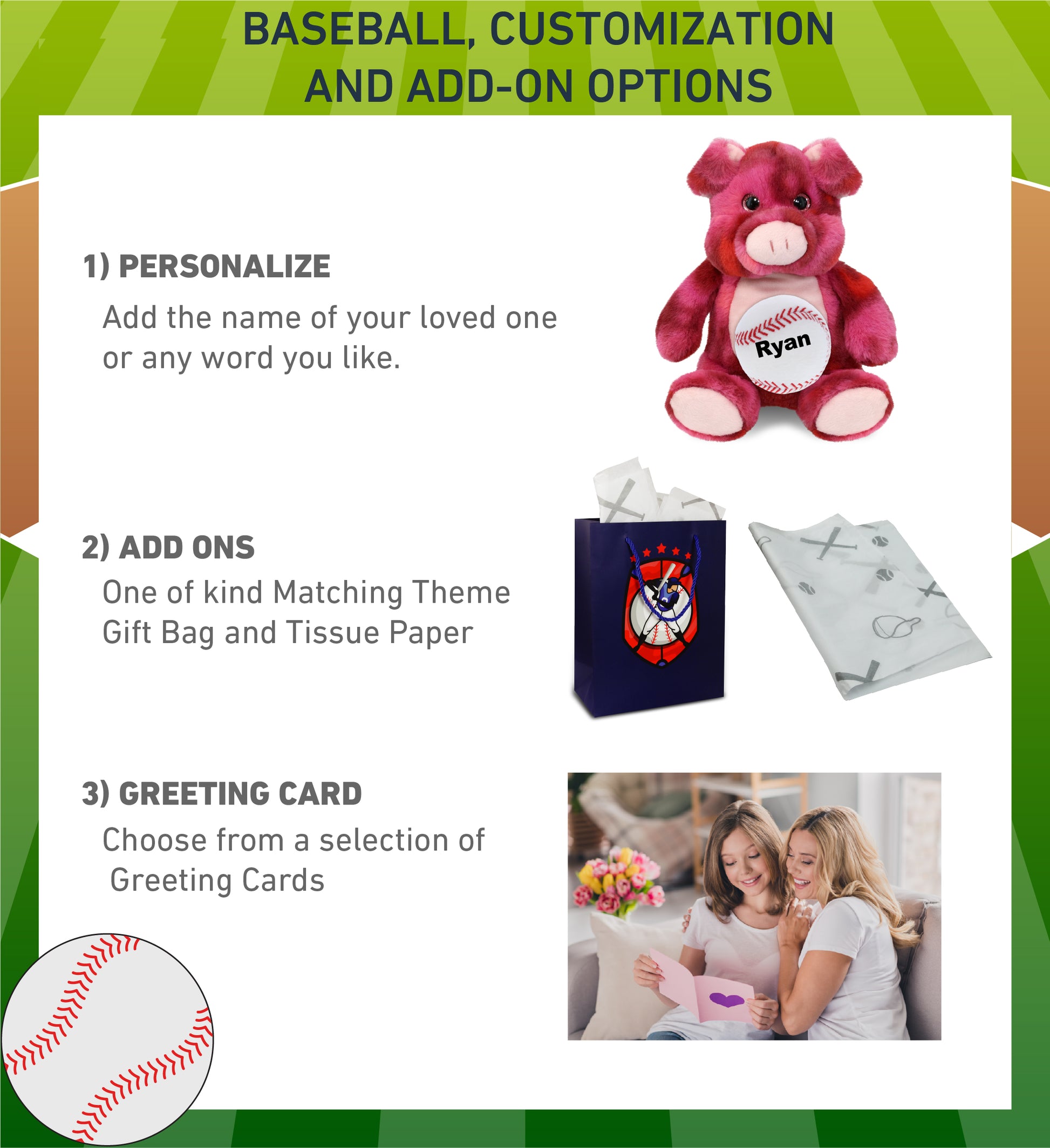Personalization, Customization, and Add-On Options - The Super Soft Sports Stuffed Animal Pink Tie-Dye Pig comes customized with a small baseball plush. You can personalize your stuffed animal pig with the name of your loved one which we will imprint on the item. You also have the option to add some or all of the cool add-ons to make your gift extra special: 1) Gift Bag; 2) Tissue Paper; 3) Greeting Card.