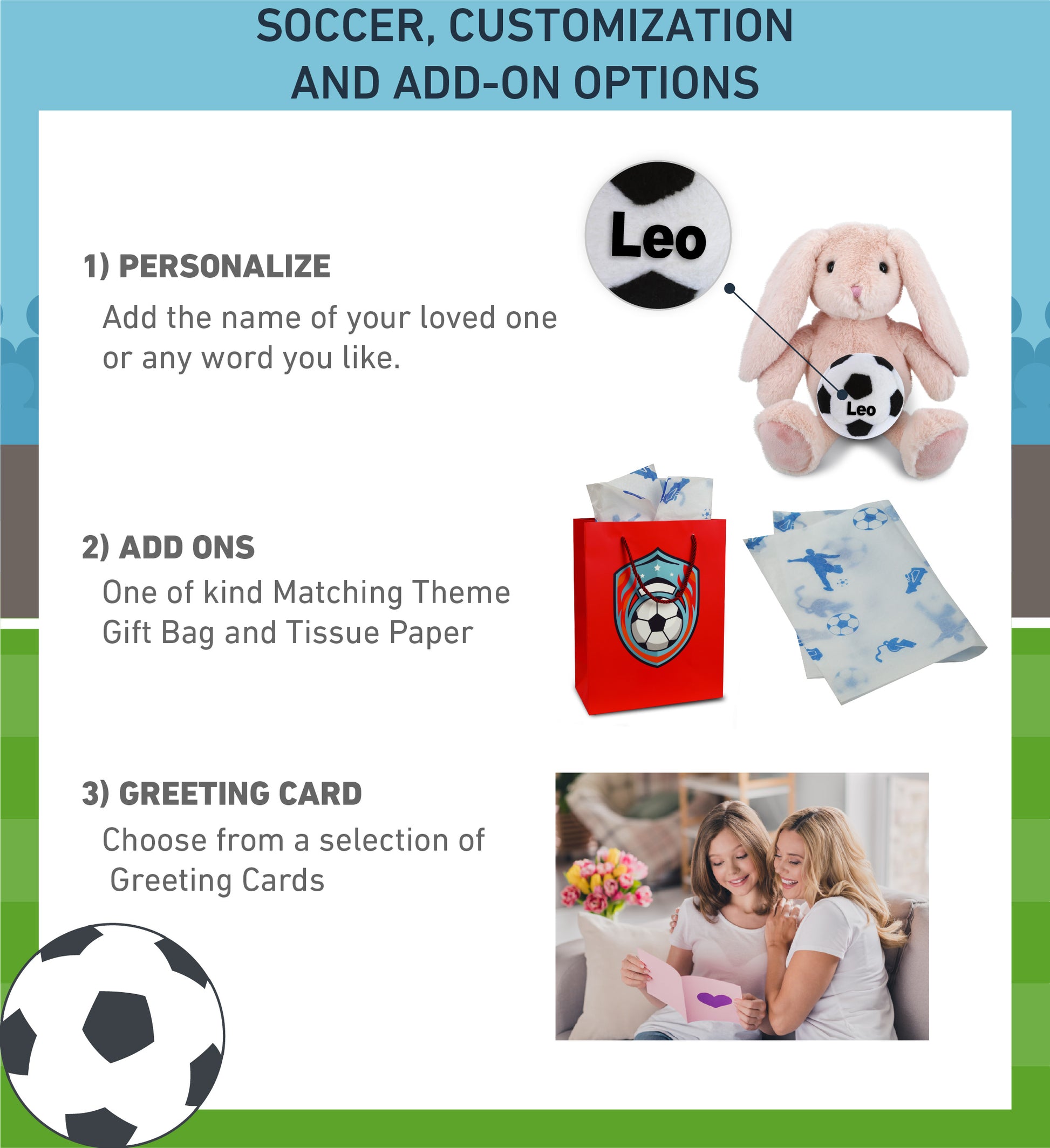 PERSONALIZATION, CUSTOMIZATION, AND ADD-ON OPTIONS - Super Soft Sports Stuffed Animal Baby Pink Rabbit comes customized with a Soccer Ball Plush. You can personalize it with the name of your loved one imprinted on the item. You also have the option to add some or all of the cool add-ons to make your gift extra special: 1) Gift Bag; 2) Tissue Paper; 3) Greeting Card.