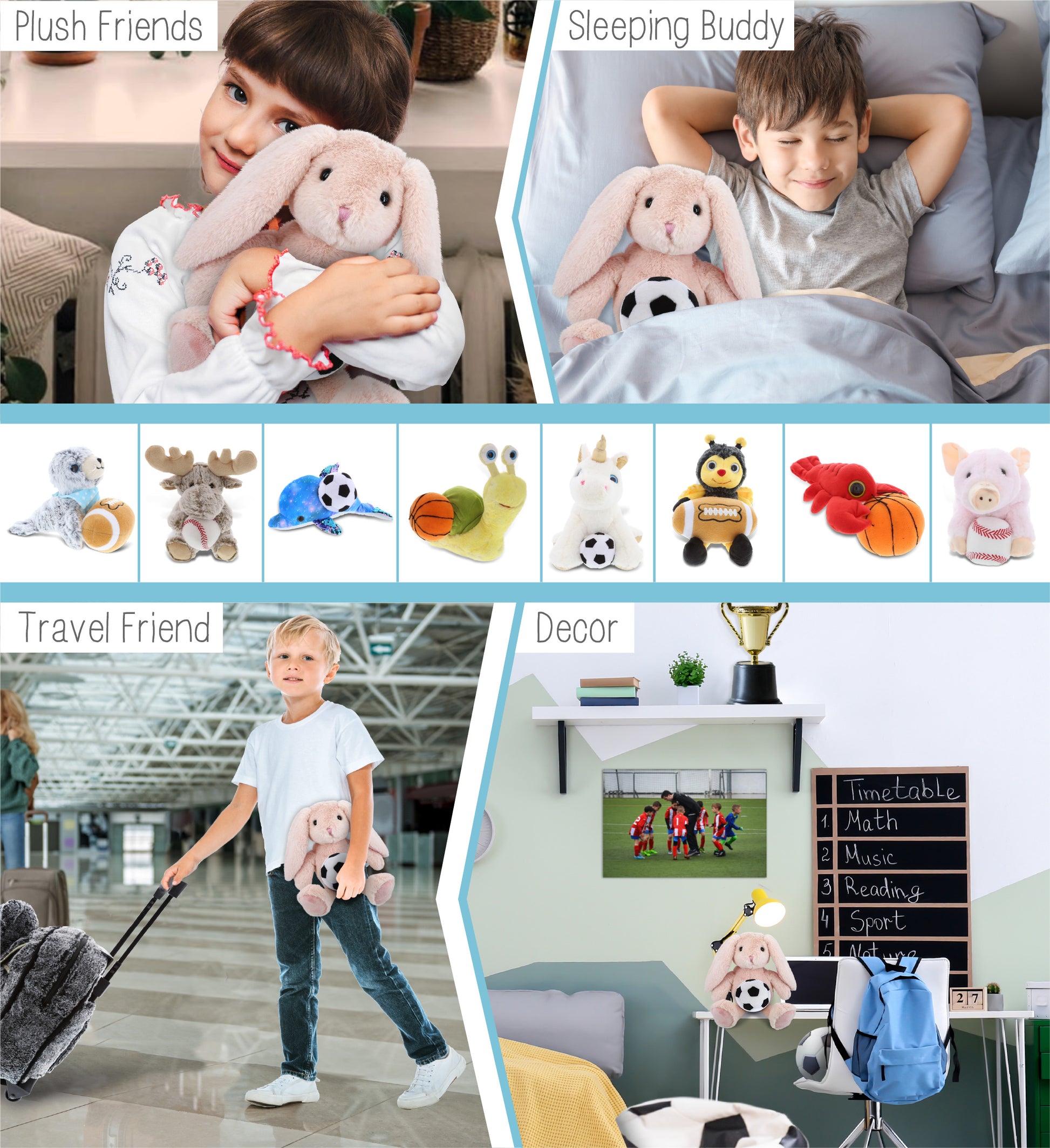 HIGH QUALITY SUPER SOFT PLUSH RABBIT STUFFED ANIMAL - The machine-sewn rabbit toy plush and soccer ball is made of premium-quality polyester, stuffed with soft fluffy polyester fillings. Made with durable and child-friendly features. Cute and snuggly rabbit sitting down upright. Cute soft toys designed to be your little one's best buddies. To maintain fluffy stuffed animals, wash rabbit plush toys with cold soapy water and allow it to air dry.