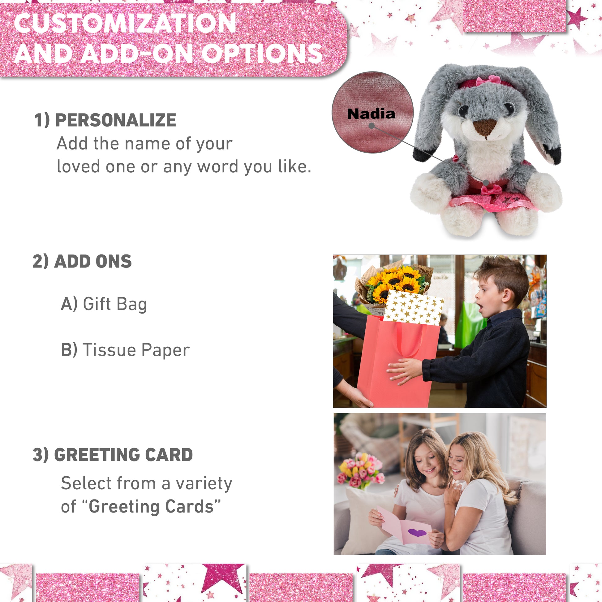 Personalization, Customization, and Add-On Options - The grey rabbit plush toy comes dressed in a charming pink ballerina outfit, complete with tutu skirt, headband, and shirt. Make it meaningful by personalizing it with the name, which we will imprint directly onto the plush. You can also customize your ballerina rabbit stuffed animal doll by adding any of our add-ons to create the perfect gift: 1) Gift Bag 2) Tissue Paper 3) Greeting Card.