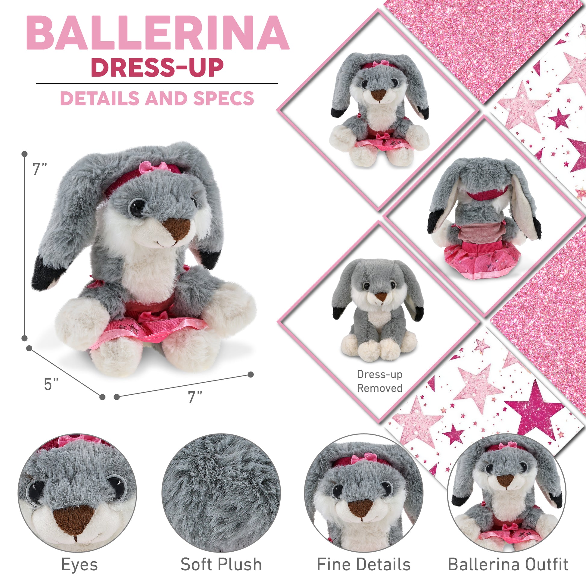 Includes 1 DolliBu Grey Rabbit Toy with Ballerina Costume - Includes one adorable stuffed animal rabbit doll dressed in a cute ballerina doll plush outfit, complete with a pink headband with a bow, tutu skirt, and a sleeveless top. This rabbit figure ballerina toy is designed to be display-worthy and a cuddle plush for girls. This cute plush rabbit ballerina doll measures approximately 7Lx5Wx7H inches and is best for kids ages 3 and up.