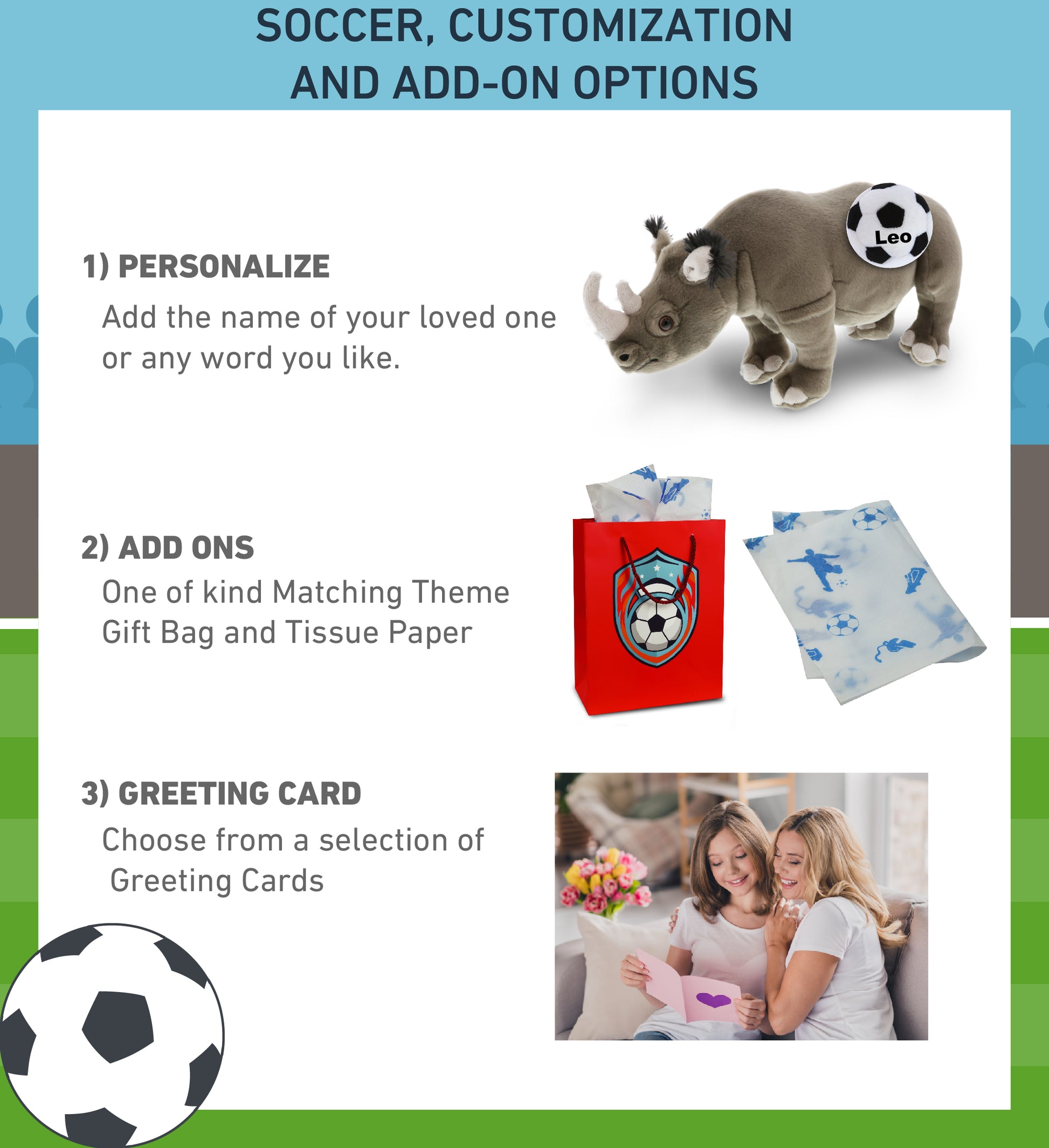 PERSONALIZATION, CUSTOMIZATION, AND ADD-ON OPTIONS - Super Soft Sports Stuffed Animal Rhino comes customized with a Soccer Ball Plush. You can personalize it with the name of your loved one imprinted on the item. You also have the option to add some or all of the cool add-ons to make your gift extra special: 1) Gift Bag; 2) Tissue Paper; 3) Greeting Card.