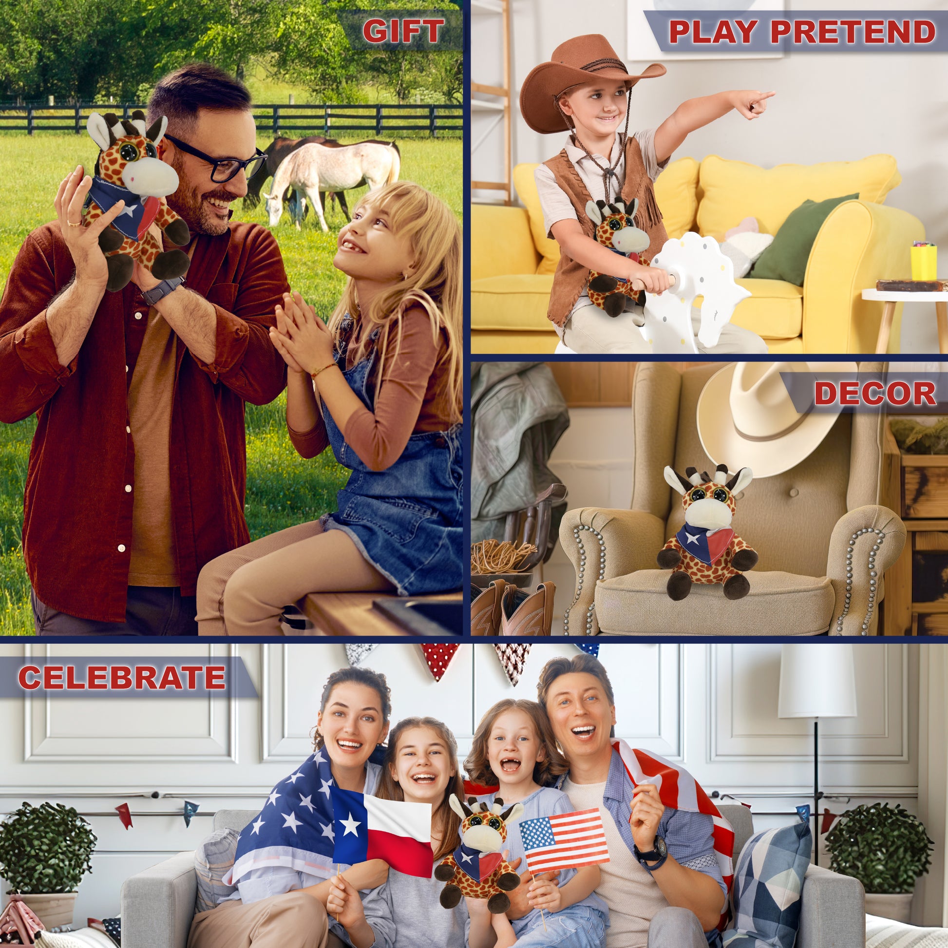 Perfect Wildlife Animal Big Eye Giraffe Plush Toy for Those Who Love Texas - Looking for Texas souvenirs, bear plush toys, or western gifts? This giraffe with a red, blue, and white Texas flag bandana is a fun choice. Ideal for gifting to cowboy fans, decor for Texas holidays or Memorial Day, or adding to a cowboy teddy bear collection. Great for collectors of cowboy stuff and stuffed animal clothing to show their Texan pride.