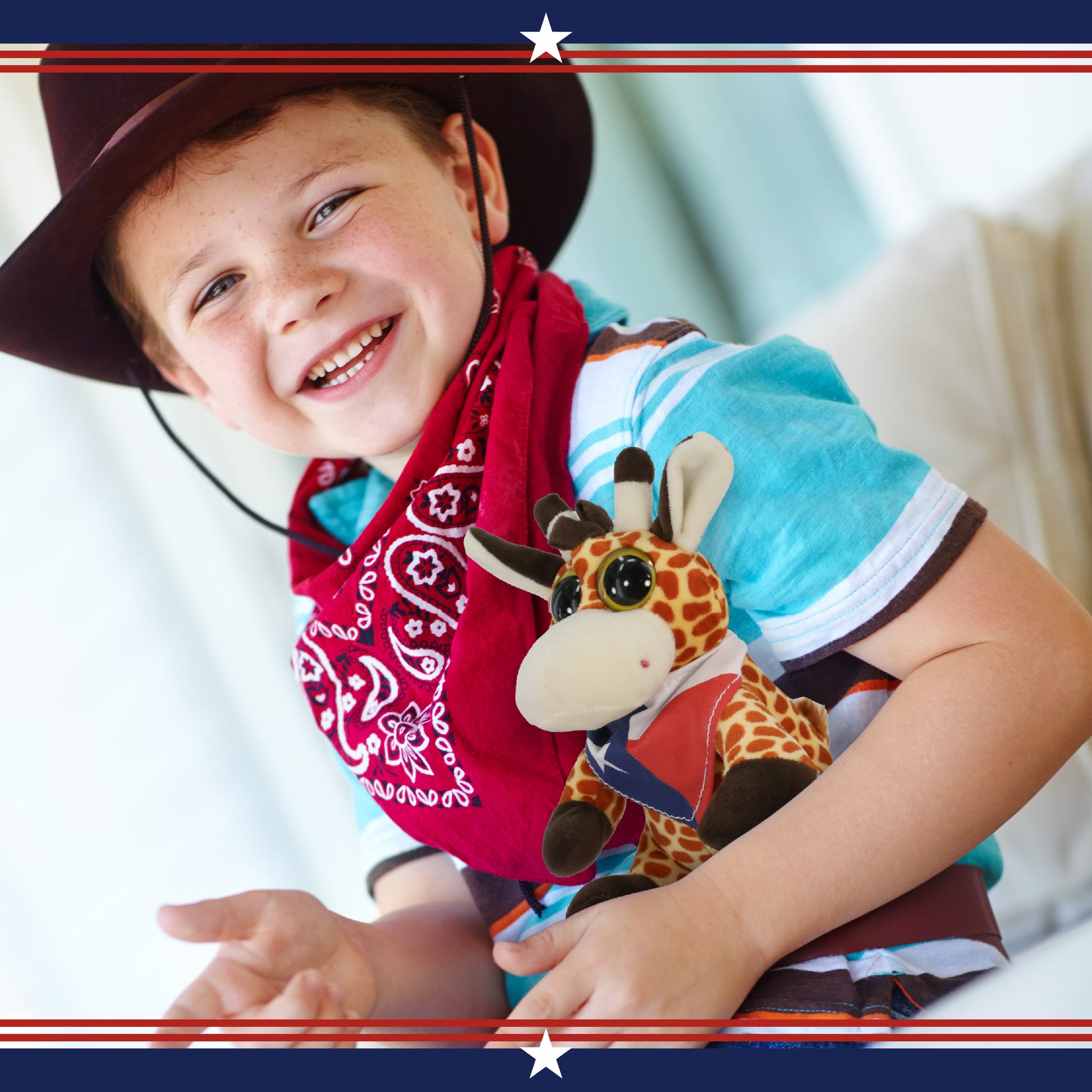 Personalization, Customization and Add-On Options - The Big Eye Giraffe stuffed animal plush comes dressed in a removable cowboy outfit accessory, a Texas flag bandana giving this plush animal a rugged western look. Make it cool by personalizing it with a name, which we will imprint directly onto the plush. You can also customize your plush bear by adding any of our add-ons to create the perfect gift: 1) Gift Bag 2) Tissue Paper 3) Greeting Card.