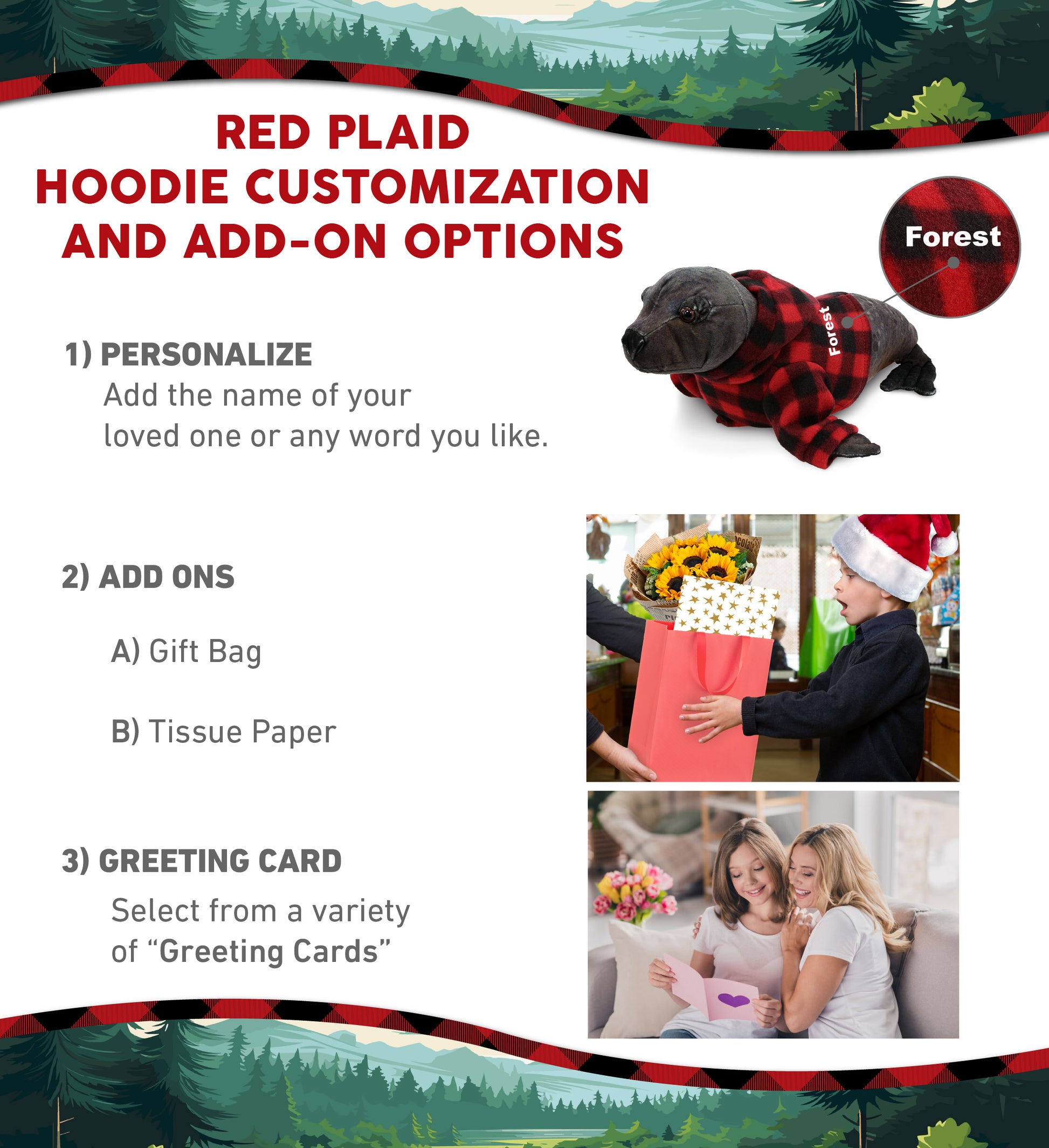 Personalization, Customization, And Add-On Options - The Super Soft Wild Collection Sea Lion Stuffed Animal comes dressed in a cozy red plaid hoodie teddy bear costume. Make the sea lion plush more special and personalize it with the name of your loved one, which we will print onto the plush. You can also customize your plush sea lion by adding any of our unique add-ons to create the perfect gift: 1) Gift Bag 2) Tissue Paper 3) Greeting Card.