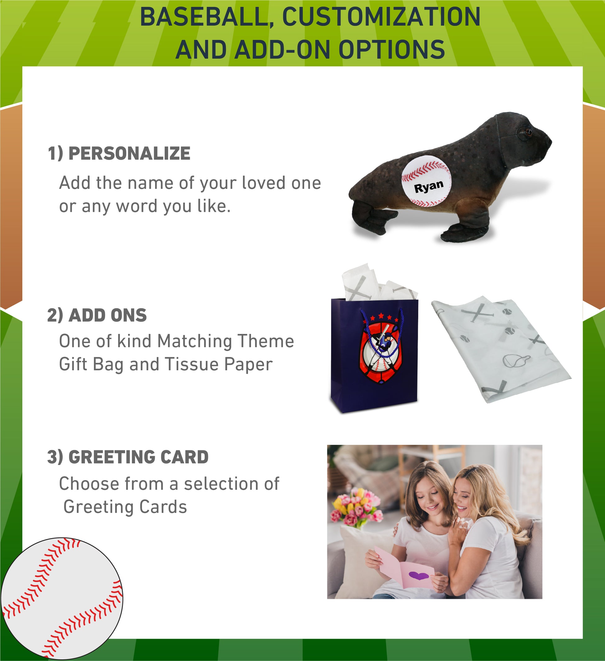 Personalization, Customization, and Add-On Options - The Super Soft Sports Stuffed Animal Sea Lion comes customized with a small baseball plush. You can personalize your stuffed animal sea lion with the name of your loved one which we will imprint on the item. You also have the option to add some or all of the cool add-ons to make your gift extra special: 1) Gift Bag; 2) Tissue Paper; 3) Greeting Card.