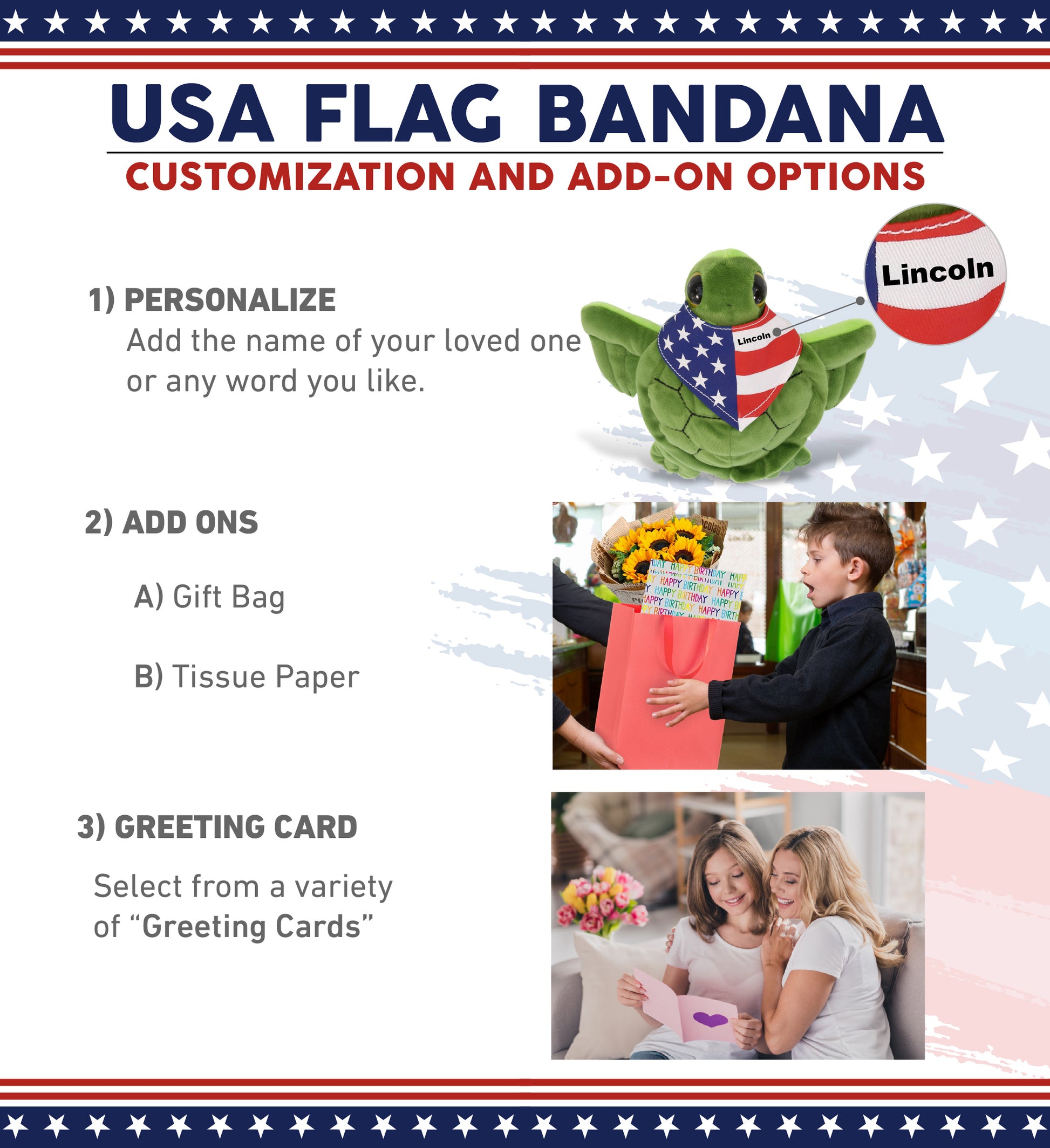 Personalization, Customization, and Add-On Options - The stuffed sea turtle plush toy comes dressed with a removable USA Flag Bandana to give a unique patriotic twist. Make the plush sea turtle toy cool and unique by personalizing it with the name, which we will imprint directly onto the plush. You can also customize your plush sea turtle by adding any of our add-ons to create the perfect gift: 1) Gift Bag 2) Tissue Paper 3) Greeting Card.