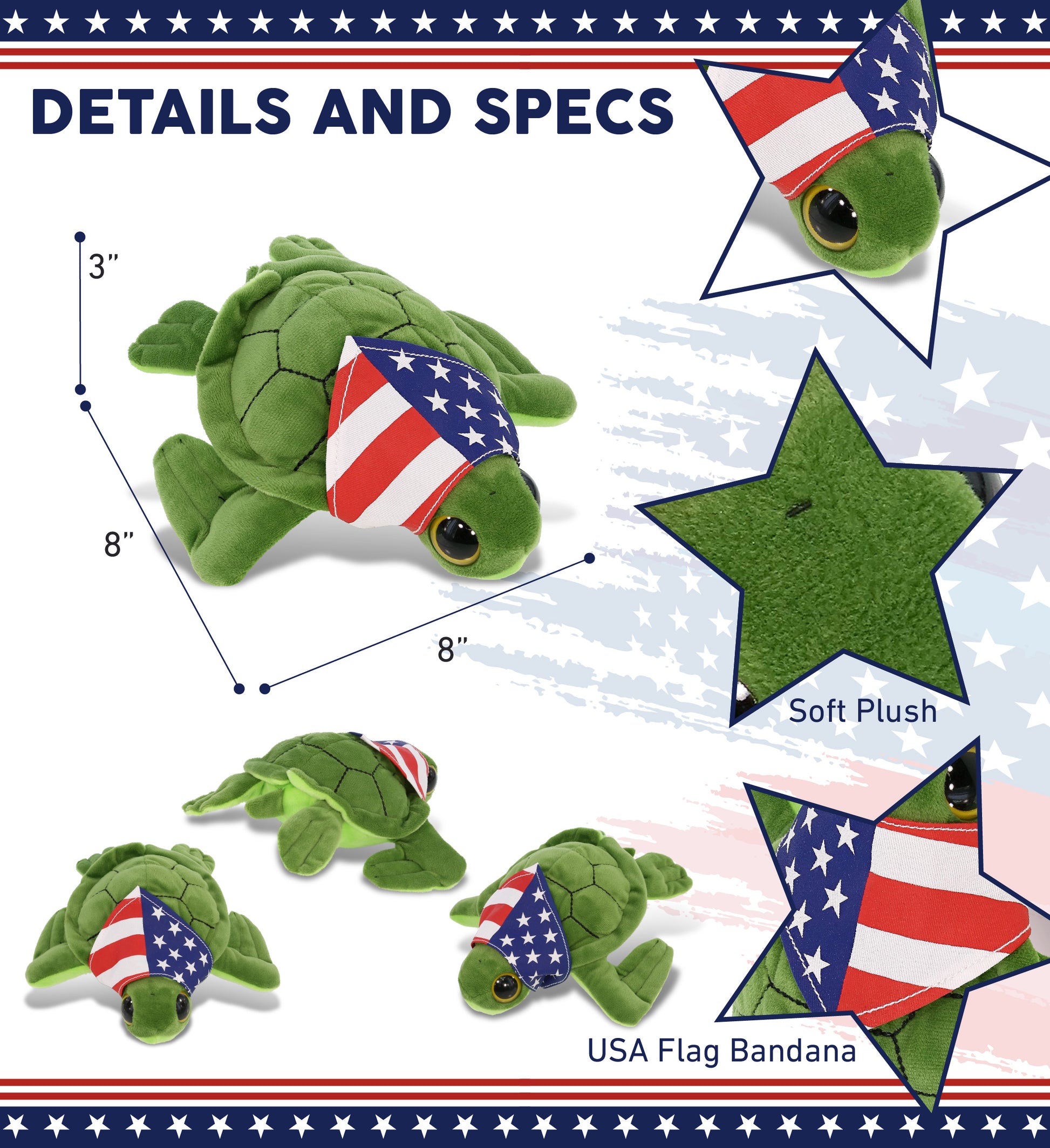 Includes 1 DolliBu Big Eye Sea Turtle Toy with USA Flag Bandana Dress Up Set - The stuffed animal sea turtle arrives with a removable red, white and blue USA flag bandana, making it a standout among stuffed animals with clothes. Turn your classic teddy bear sea turtle into collectible patriotic stuffed animal perfect for celebrating USA holidays. The sea turtle stuffed animal measures 8Lx8Wx3H inches and is for kids ages 0 and up.