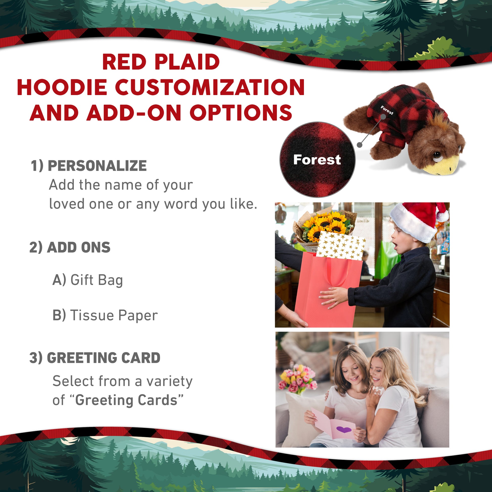 Personalization, Customization, And Add-On Options - The Super Soft Small Brown Sea Turtle Stuffed Animal comes dressed in a cozy teddy bear costume, a red plaid hoodie. Make your turtle plush more special and personalize it with the name of your loved one, which we will print onto the plush. You can also customize your plush turtle by adding any of our unique add-ons to create the perfect gift: 1) Gift Bag 2) Tissue Paper 3) Greeting Card.