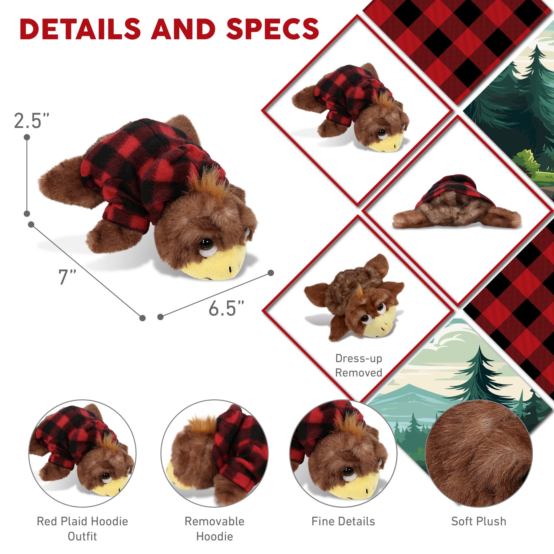 Included with The Purchase of Sea Turtle Plush with Red Plaid Hoodie Jacket - Includes 1 Small Brown Sea Turtle with Red Flannel Plaid Shirt. Dressed in flannel hooded jacket, the stuffed turtle is all about comfort and style, making it the perfect addition to your Christmas plush animals decor for your Christmas tree, ready to join your holiday photos or family gatherings. The turtle with cute red checkered shirt measures 7Lx6.5Wx2.5H inches.