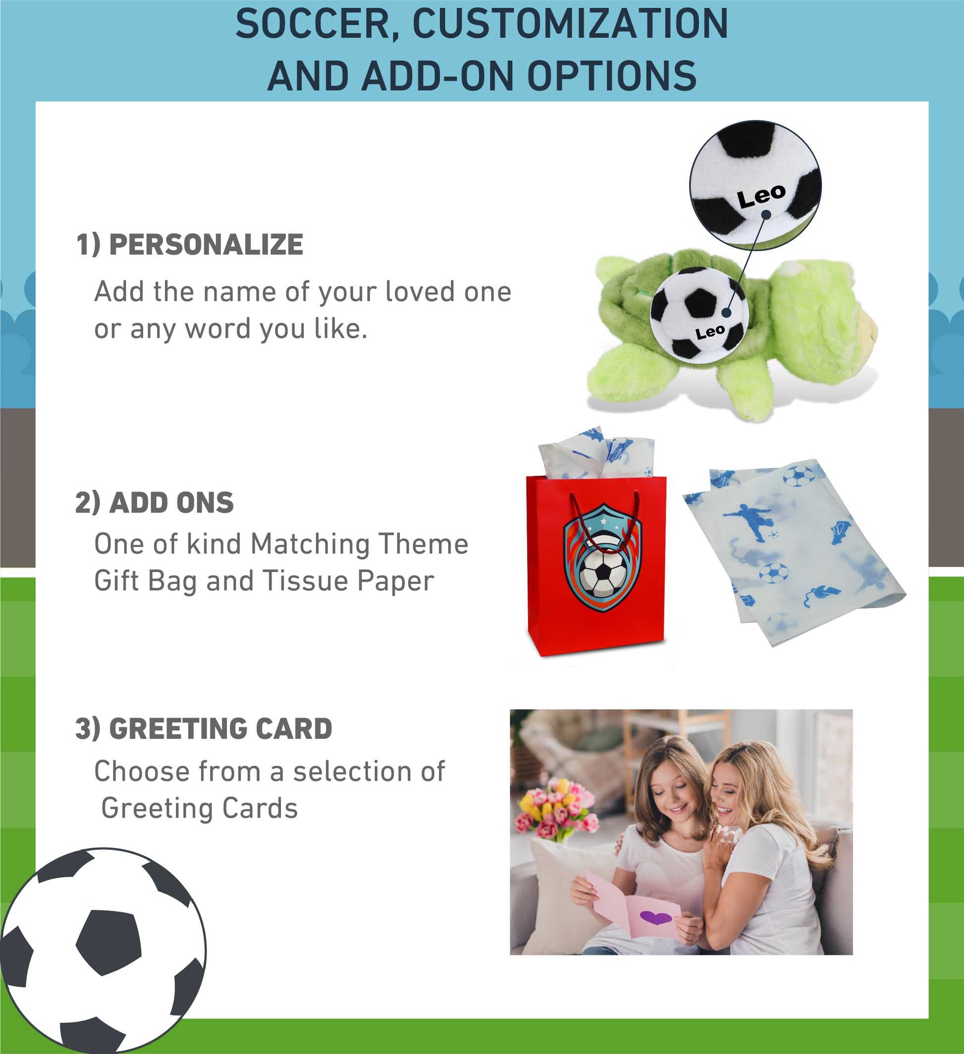 Personalization, Customization, and Add-On Options - Super Soft Large Green Sea Turtle sports stuffed animal comes customized with a Soccer Ball Plush. You can personalize your sea turtle plush with the name of your loved one imprinted on the item. You also have the option to add some or all of the cool add-ons to make your gift extra special: 1) Gift Bag; 2) Tissue Paper; 3) Greeting Card.