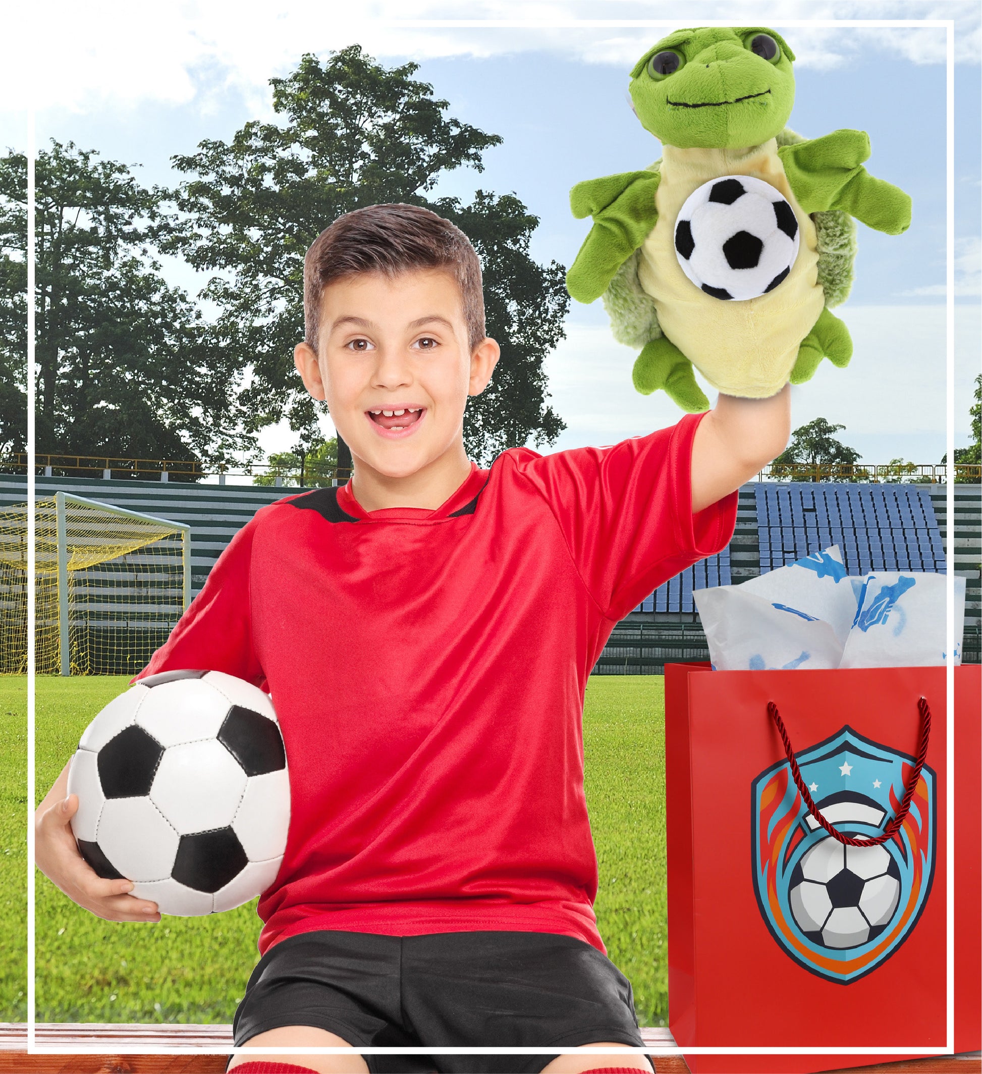 Personalization, Customization, and Add-On Options - This Super Soft Sports Stuffed Animal Sea Turtle Hand Puppet comes customized with a Soccer Ball Plush. You can personalize your sea turtle hand puppet with the name of your loved one imprinted on the item. You also have the option to add some or all of the cool add-ons to make your gift extra special: 1) Gift Bag; 2) Tissue Paper; 3) Greeting Card.