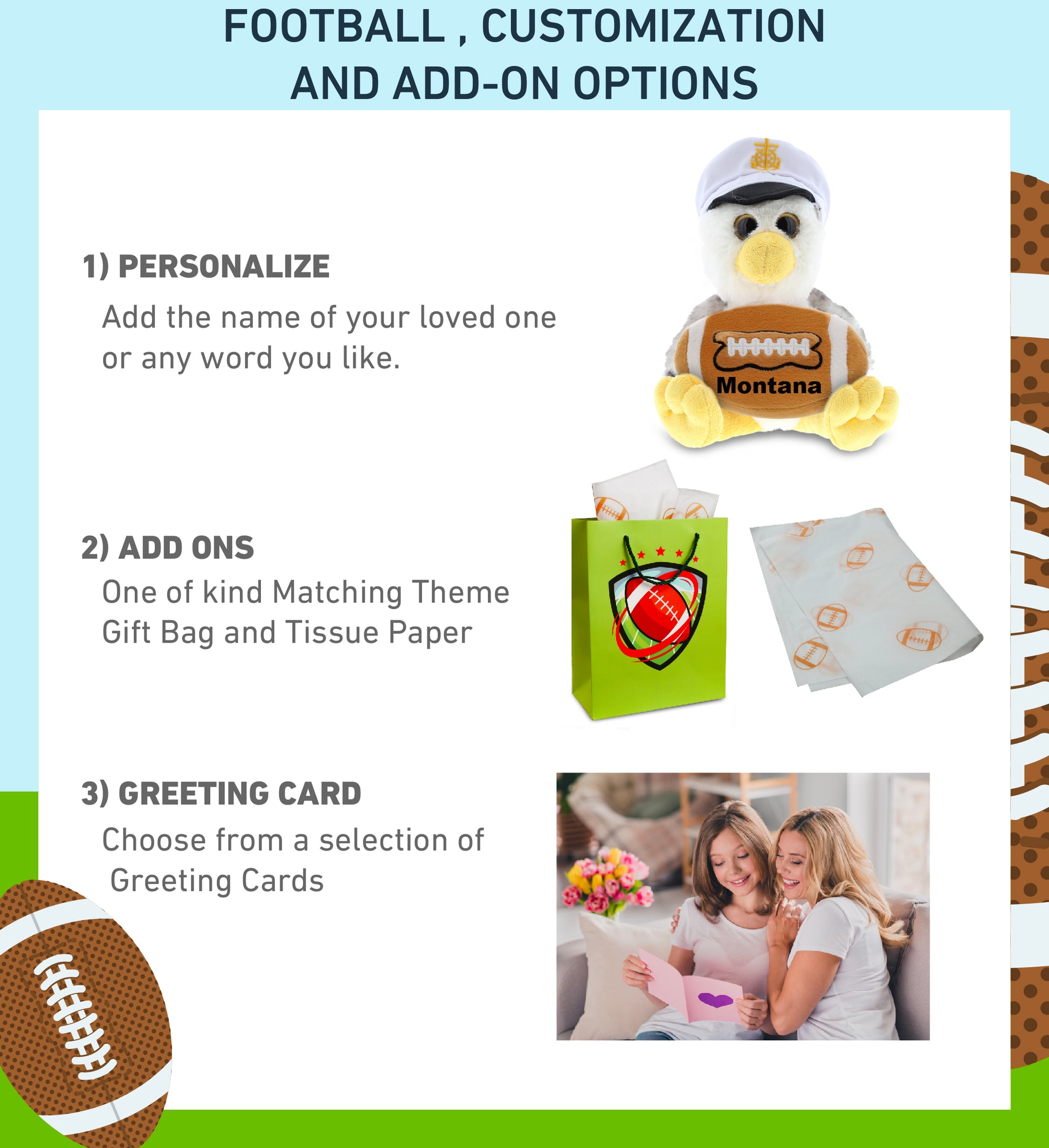 Personalization, Customization, and Add-On Options - This Super Soft Sports Stuffed Animal Super Soft Seagull Sailor comes customized with a football plush. You can personalize it with the name of your loved one imprinted on the item. You also have the option to add some or all of the cool add-ons to make your gift extra special: 1) Gift Bag; 2) Tissue Paper; 3) Greeting Card.