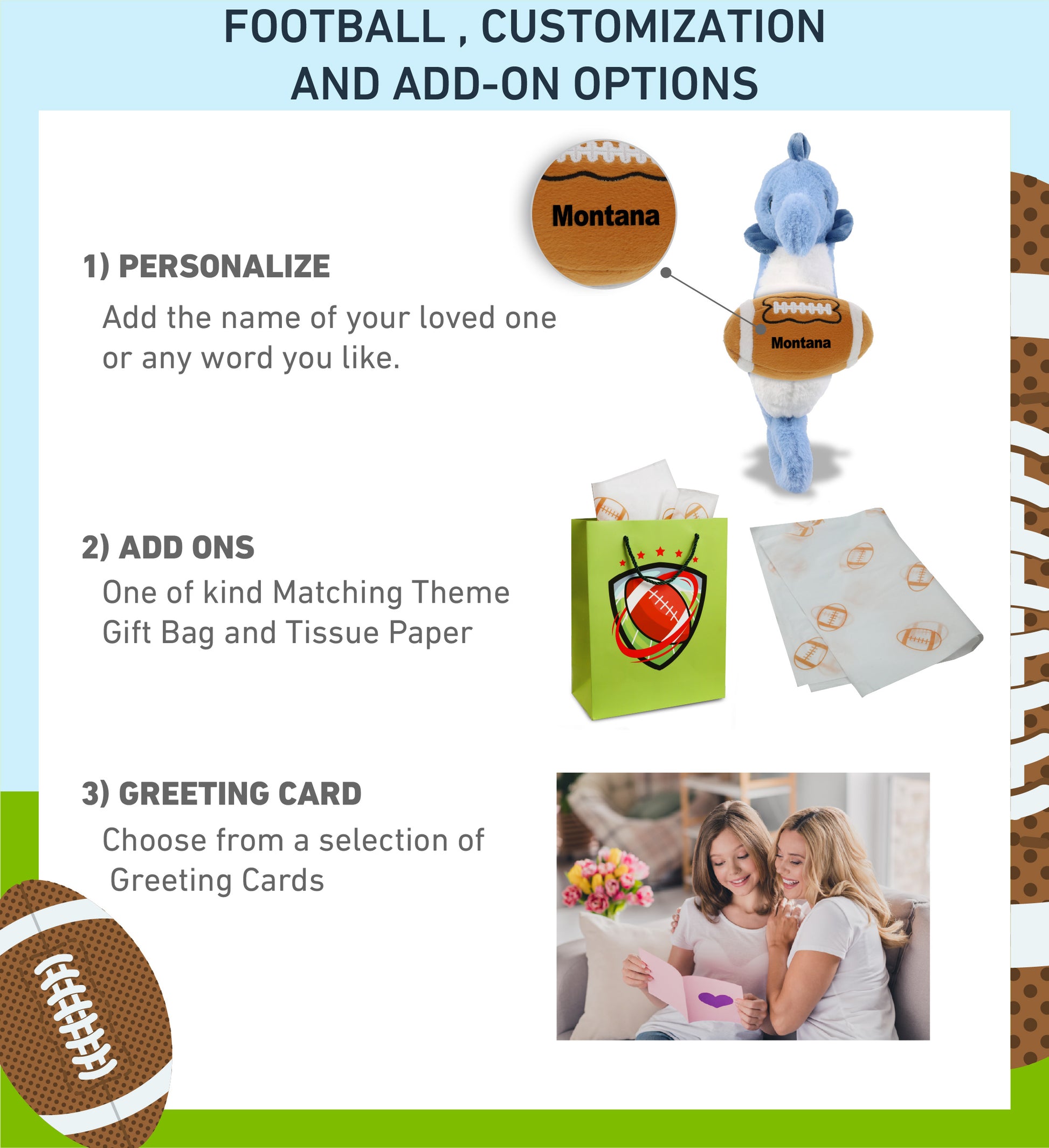 Personalization, Customization, and Add-On Options - This Super Soft Sports Stuffed Animal Blue Seahorse Plush comes customized with a football plush. You can personalize it with the name of your loved one imprinted on the item. You also have the option to add some or all of the cool add-ons to make your gift extra special: 1) Gift Bag; 2) Tissue Paper; 3) Greeting Card.