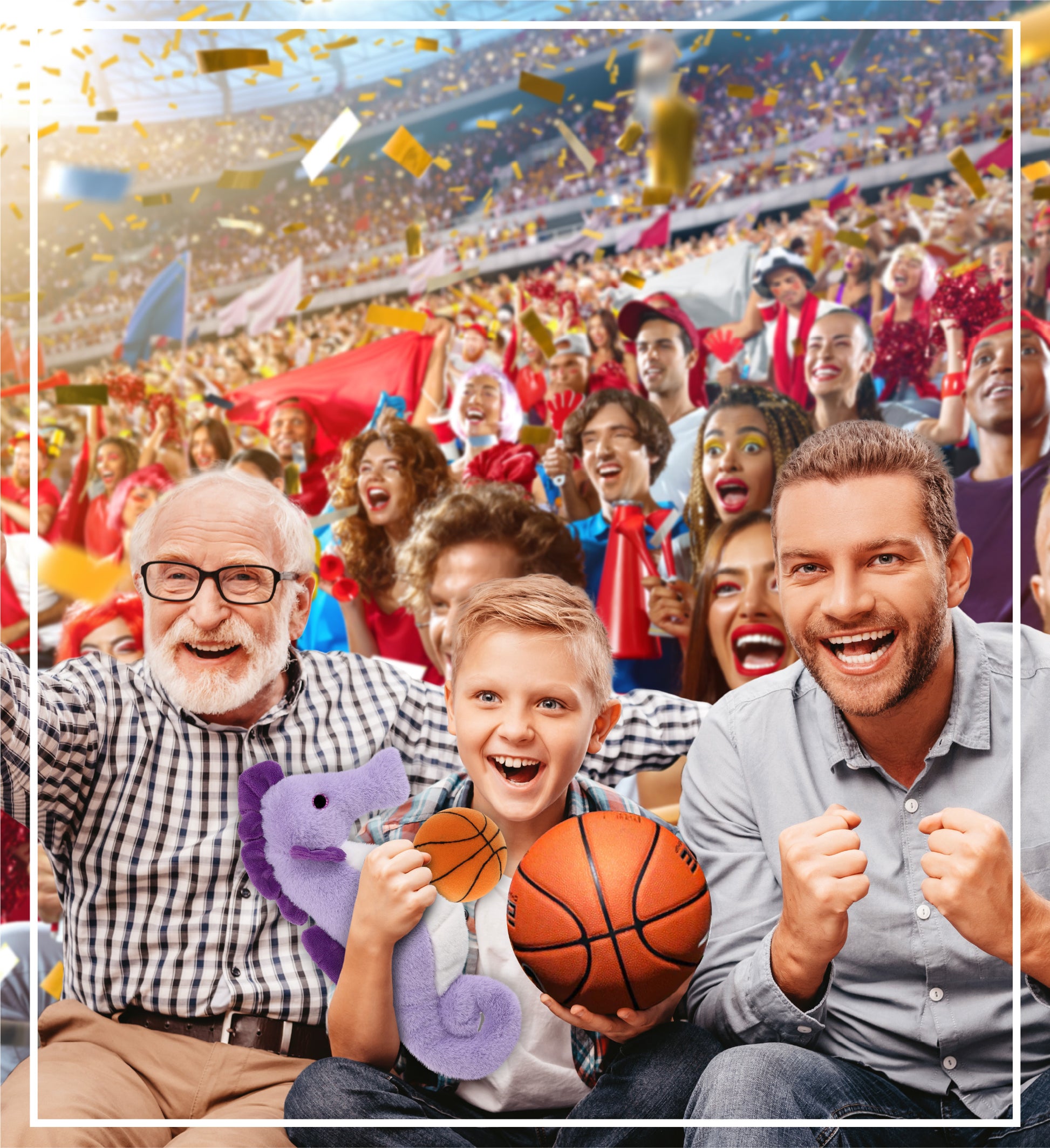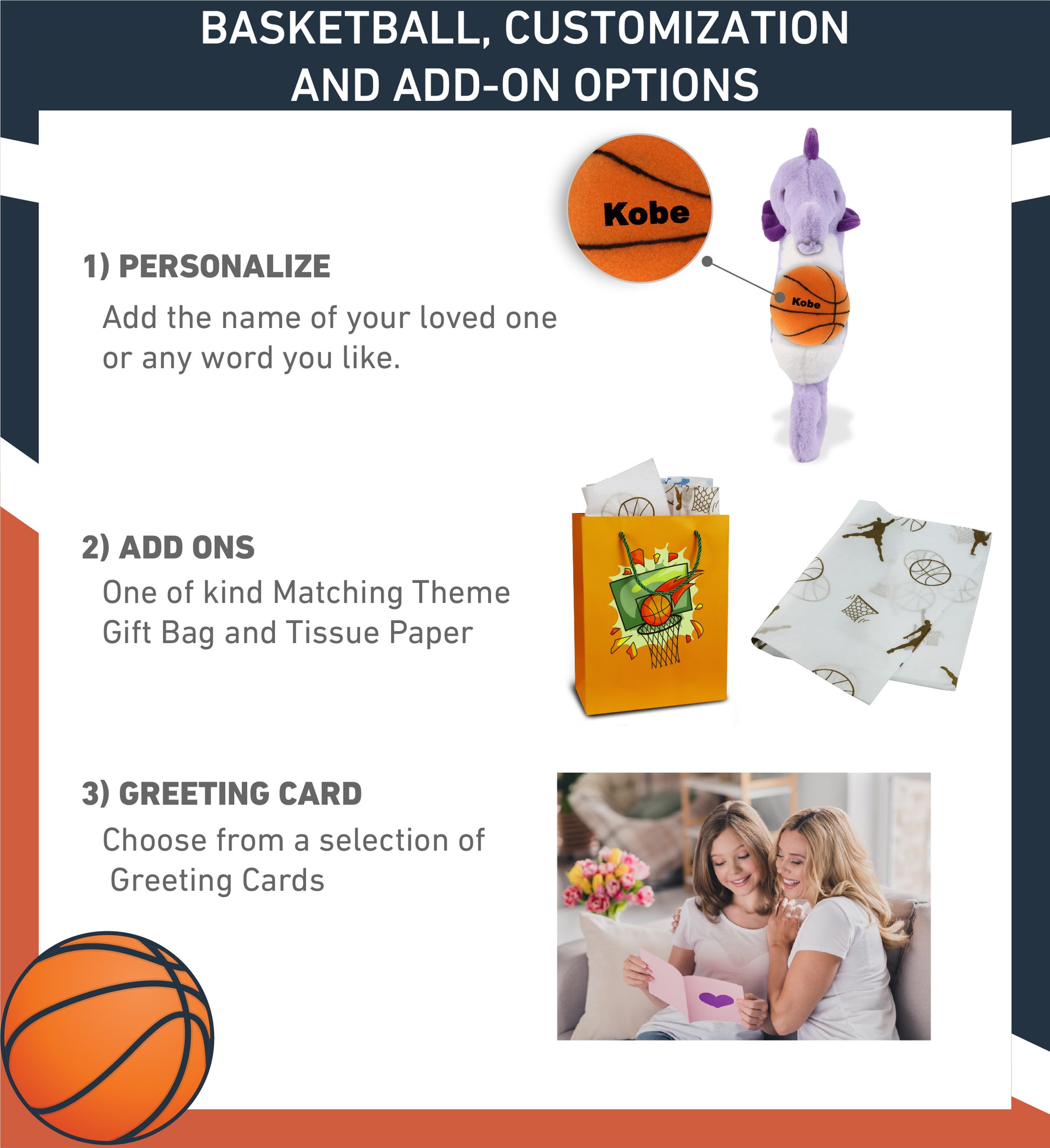 Personalization, Customization, and Add-on Options - The Super Soft Sports Stuffed Animal Purple Seahorse comes customized with a basketball plush. You can personalize your seahorse plush toy with the name of your loved one, which we will imprint on the item. You also have the option to add some or all of the cool add-ons to make your plush gift extra special: 1) Gift Bag; 2) Tissue Paper; 3) Greeting Card.