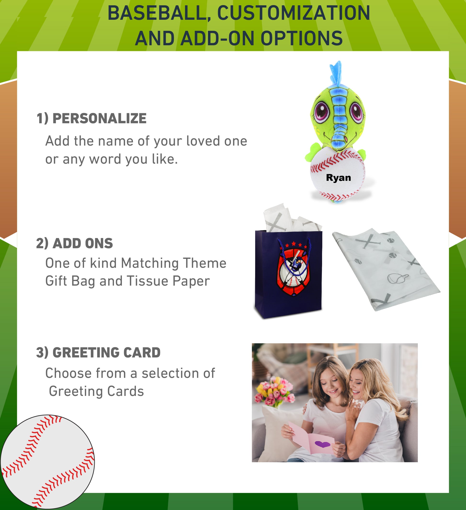 Personalization, Customization, and Add-On Options - The Super Soft Sports Stuffed Animal Seahorse comes customized with a small baseball plush. You can personalize your stuffed animal seahorse with the name of your loved one which we will imprint on the item. You also have the option to add some or all of the cool add-ons to make your gift extra special: 1) Gift Bag; 2) Tissue Paper; 3) Greeting Card.