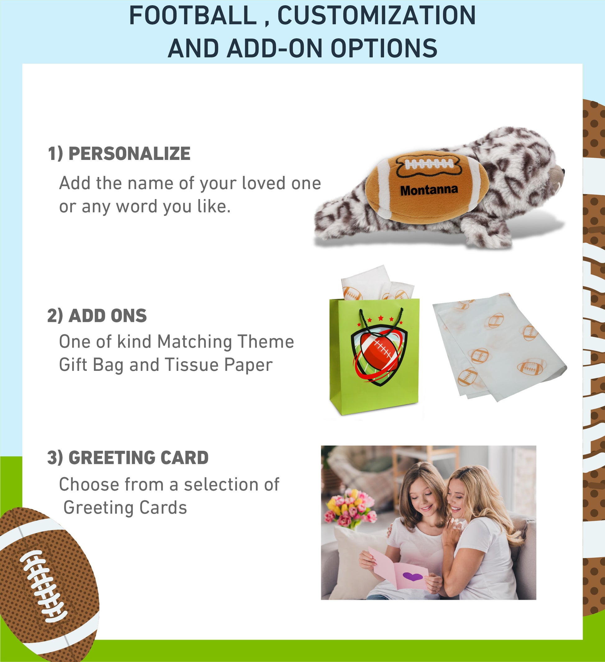 PERSONALIZATION, CUSTOMIZATION, AND ADD-ON OPTIONS - Super Soft Sports Stuffed Animal Seal comes customized with a Football Plush. You can personalize it with the name of your loved one imprinted on the item. You also have the option to add some or all of the cool add-ons to make your gift extra special: 1) Gift Bag; 2) Tissue Paper; 3) Greeting Card.