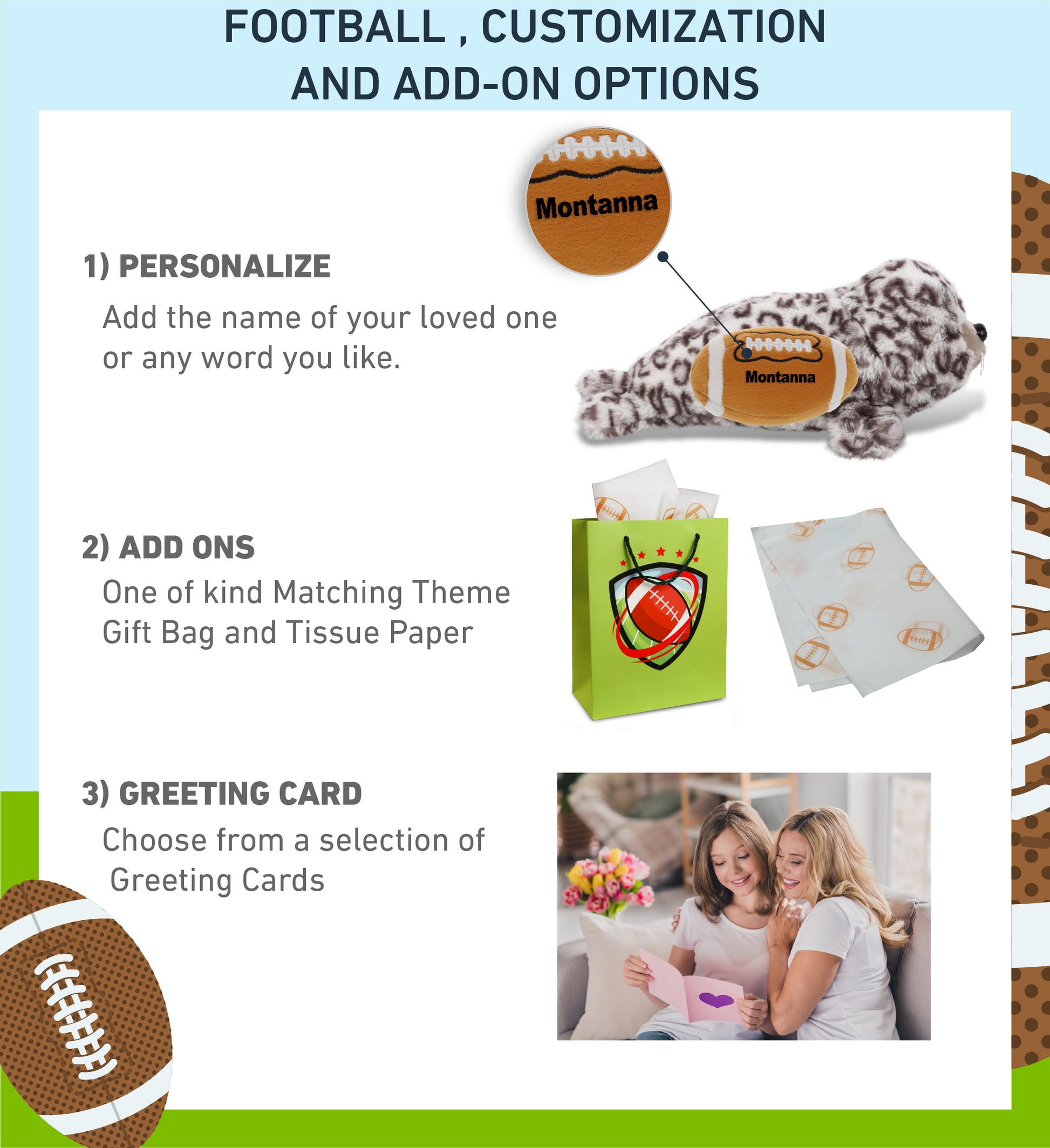 PERSONALIZATION, CUSTOMIZATION, AND ADD-ON OPTIONS - Super Soft Sports Stuffed Animal Seal comes customized with a Football Plush. You can personalize it with the name of your loved one imprinted on the item. You also have the option to add some or all of the cool add-ons to make your gift extra special: 1) Gift Bag; 2) Tissue Paper; 3) Greeting Card.