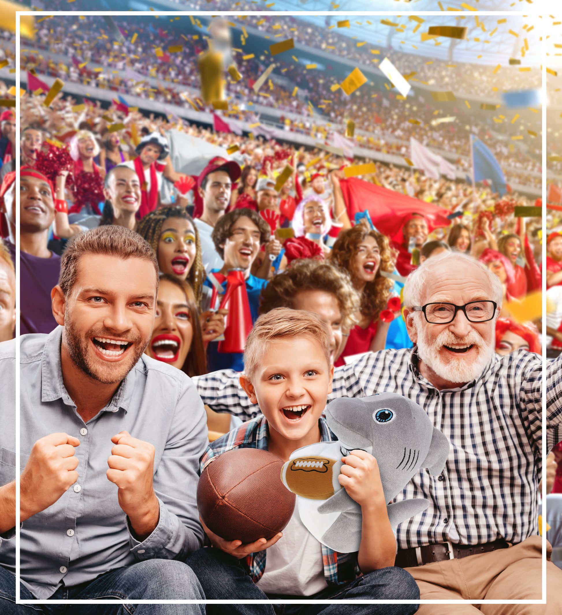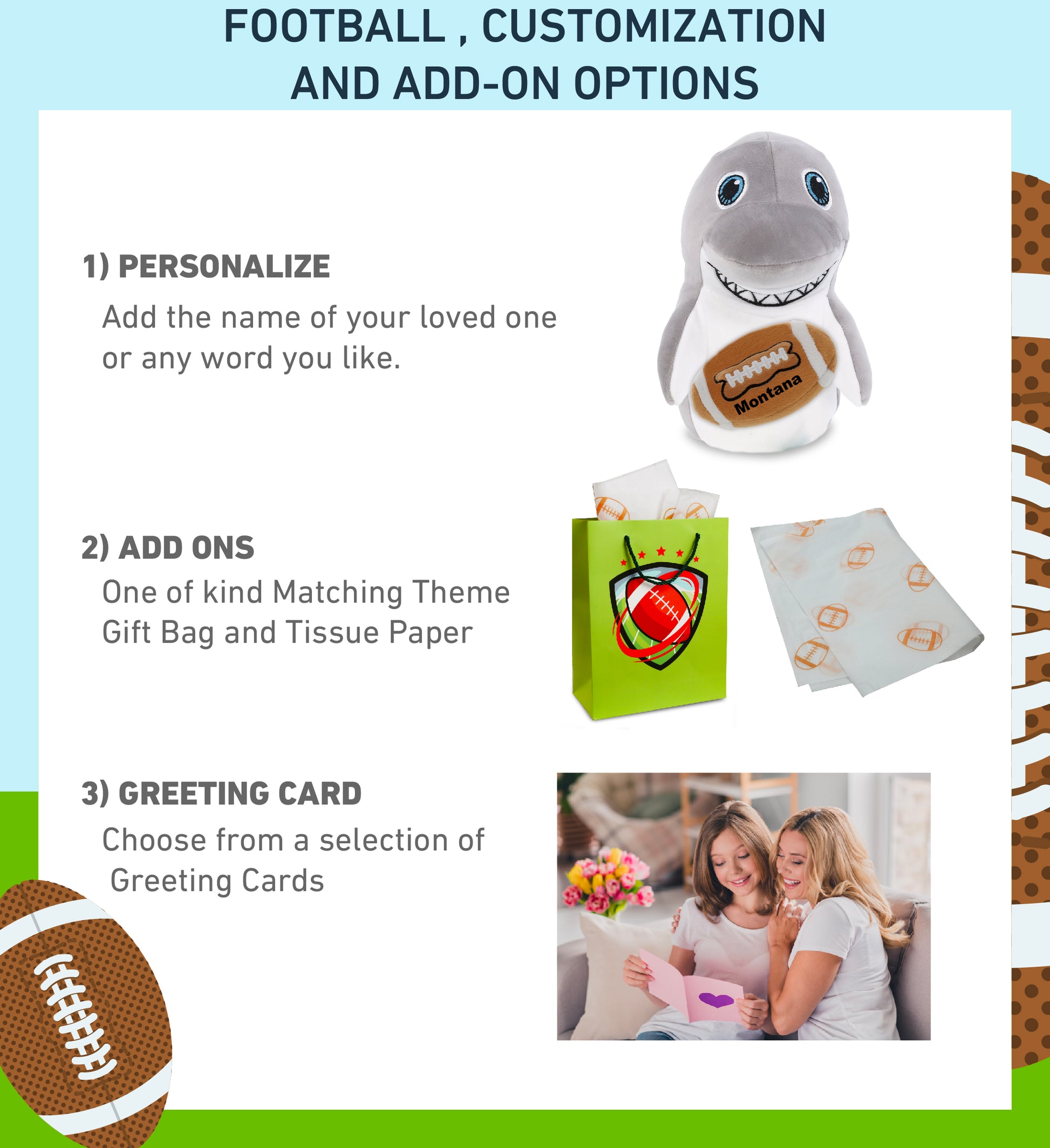 Personalization, Customization, and Add-On Options - This Super Soft Sports Stuffed Animal Snug-Mooshies Standing Shark Plush comes customized with a football plush. You can personalize it with the name of your loved one imprinted on the item. You also have the option to add some or all of the cool add-ons to make your gift extra special: 1) Gift Bag; 2) Tissue Paper; 3) Greeting Card.