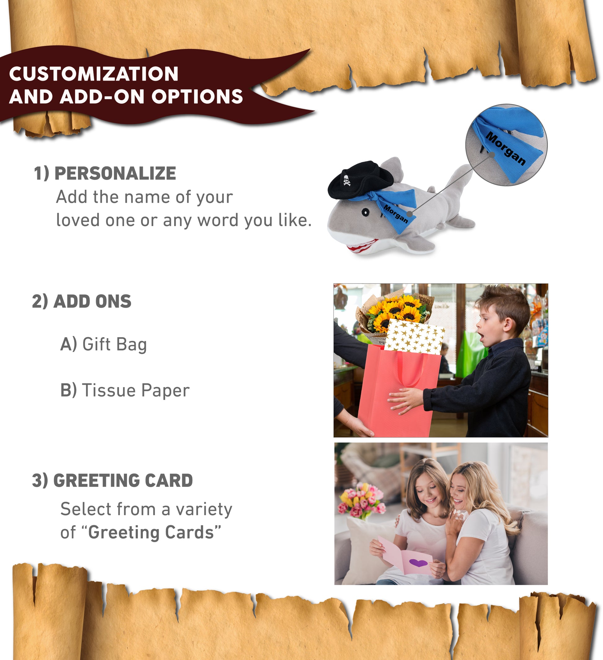 Personalization, Customization, and Add-On Options - The stuffed animal plush shark figure stuffed toy comes with a cute pirate hat. Make your plush grey shark special by adding a personalized name, which we will imprint onto the plush. You can also customize your stuffed animal pirate shark doll by adding any of our add-ons to create the perfect gift: 1) Gift Bag 2) Tissue Paper 3) Greeting Card.