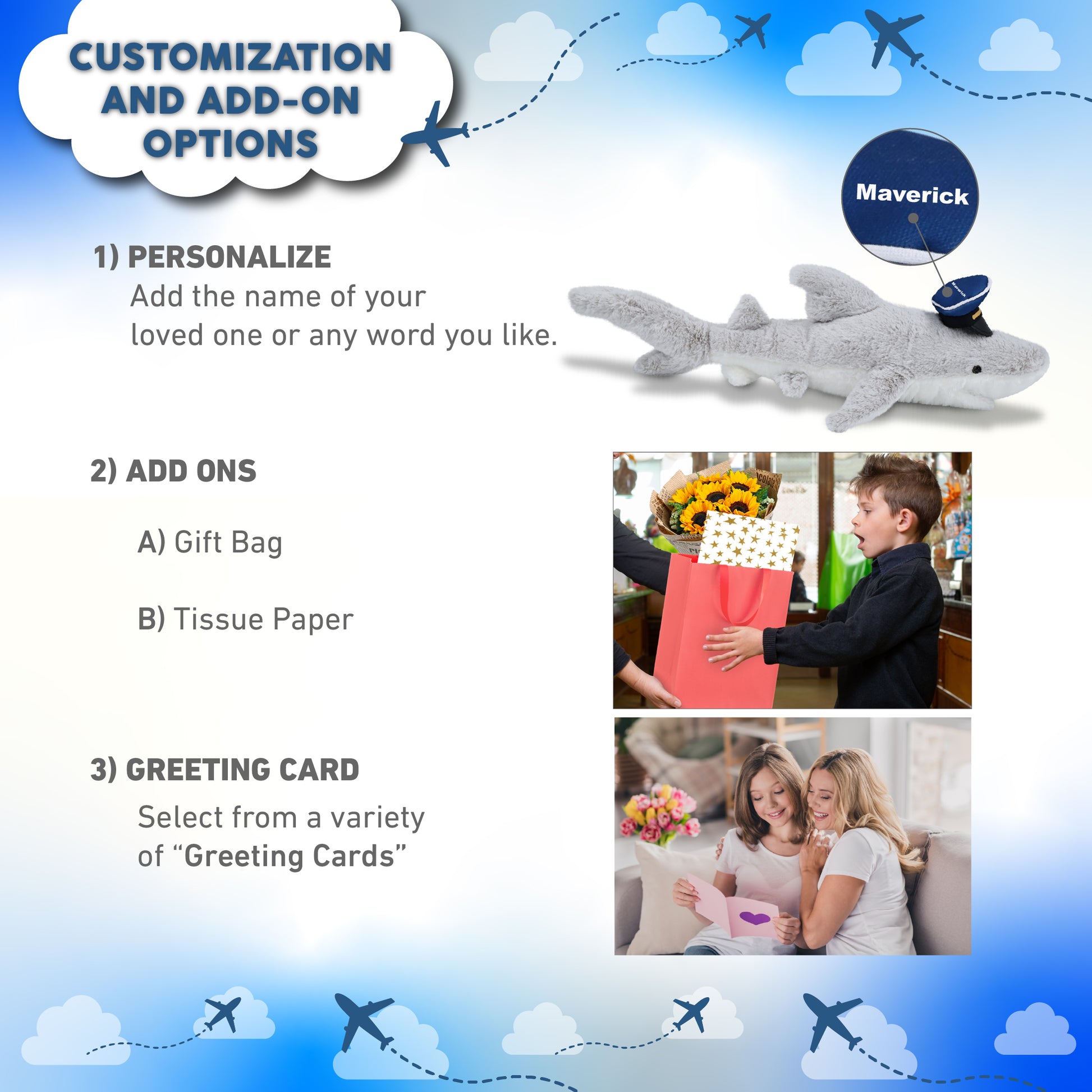 Personalization, Customization, and Add-On Options - The shark stuffed animal comes dressed with a cute captain cap. Make your pilot stuffed bear special by adding a personalized name, which we will imprint onto the plush. You can customize your plush pilot toy by adding any of our add-ons to create the perfect gift: 1) Gift Bag 2) Tissue Paper 3) Greeting Card.
